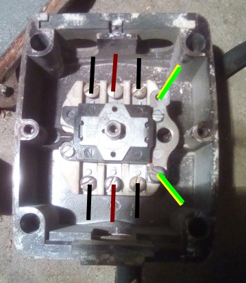 Koukám, že je tu poněkud zmatek. Takže. Fázové vodiče, jedno jakých barev, mimo žlutozelené, přijdou na šroubky, které jsou ve žlábkách porcelánového tělesa. Je jich šest, stejných. Dráty od vidlice třeba dolů a dráty od motoru nahoru. Ochranný vodič od vidlice a od motoru zapojit na můstek vpravo na obrázku.