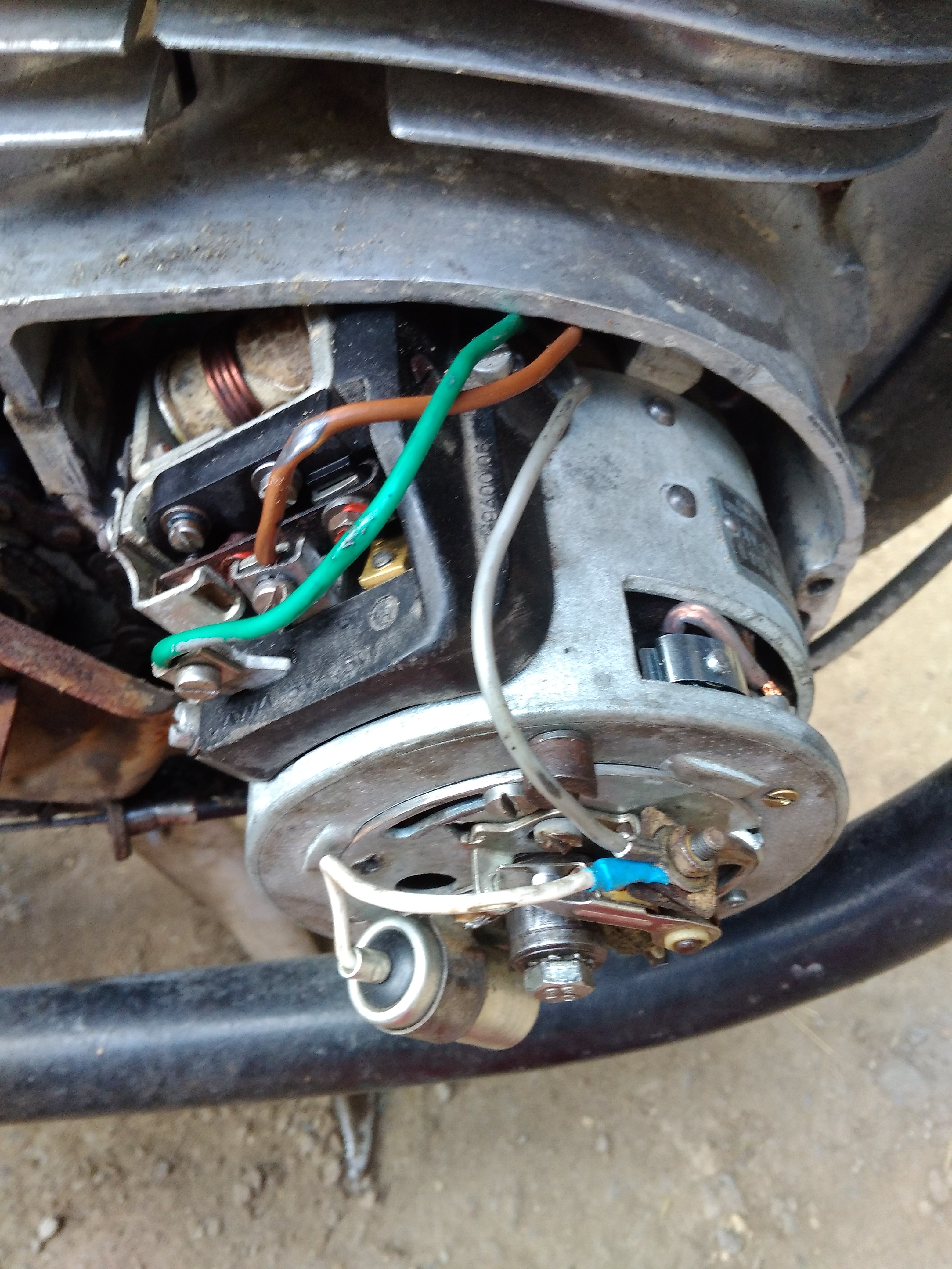 Ahoj všichni. Sehnali jsme ČZ 175, byla za pár korun a kompletní. Je předělávaná (předek 350, blinkry Simson atd..). Všechno funguje jak má kromě dobíjení. Relé spíná jak má, uhlíky včetně držáku jsme včera vyměnili a pořád nic. Rotor a zapalování vyčištěno. Baterka má 6.19V když je nastartovana (taky nově koupená). Prosím o radu, nesetkal se někdo se stejným problémem? Do teď jsem viděl zapalování jen u pionýra tak nevím po čem jít ani jak to proměřit. Díky moc
