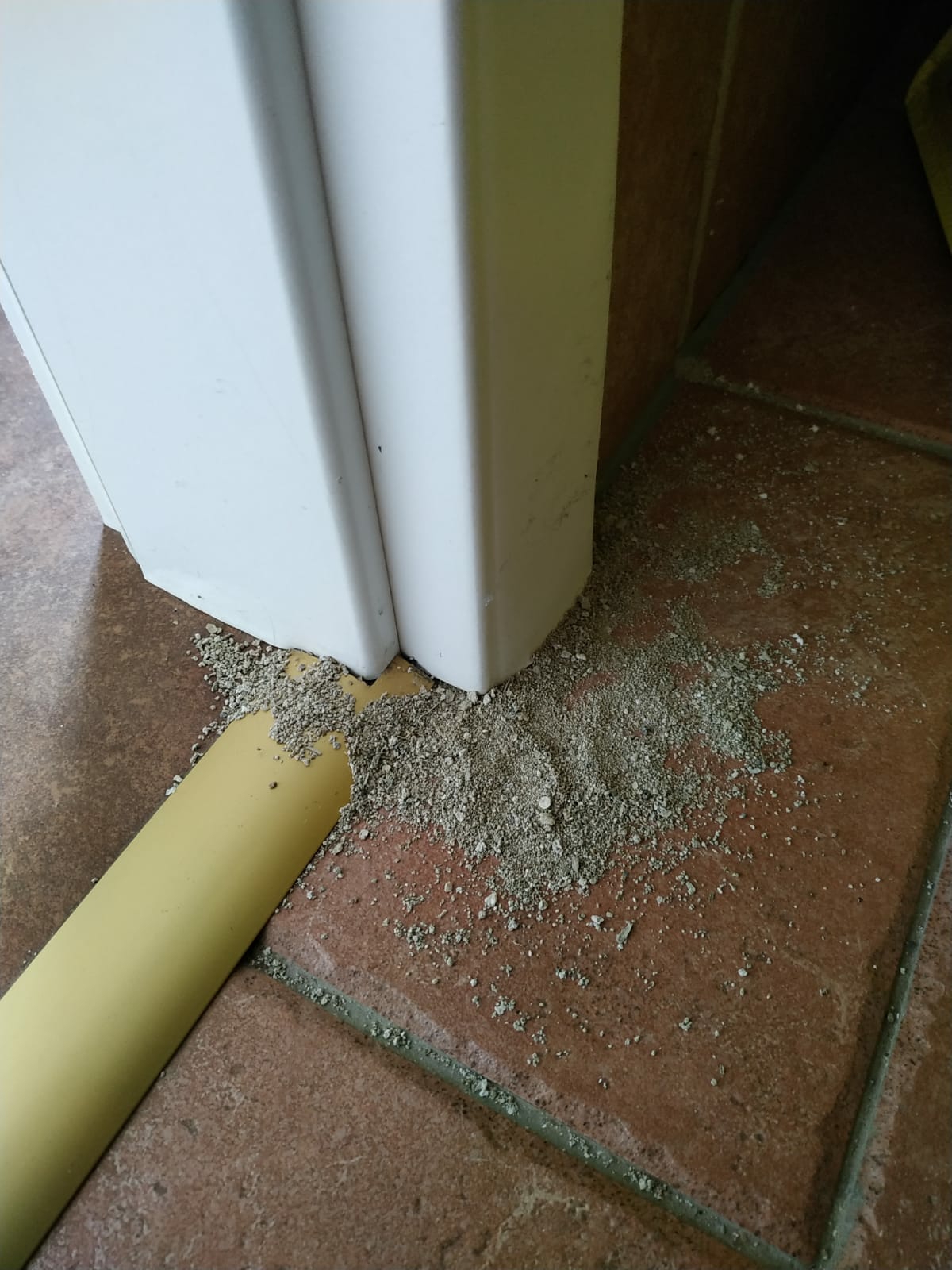 Zdravím, poslední dobou se začala v domě u jednoho mezipraží objevovat jakási suť, prach.. viz přiložený obrázek. Tohle tam teď vzniklo někdy během dopoledne. Je to mezi chodbou a technickou místností. Pod technickou místností směrem ven vede potrubí - ale nenapadá mě souvislost. Nějaký škůdce, co by se živil betonem - toho taky neznám. Nechápu, jak je možné, že se to tak vysype malou škvírou ven.. Nenapadá vás, co by to mohlo způsobovat? Vypadá to, že by to snad šlo zpoza futer , když by to šlo zespodu tak se to asi nevysype směrem nahoru - ven. Díky za rady. Snad nebudu muset shazovat futra - popravdě ani nevím jak.