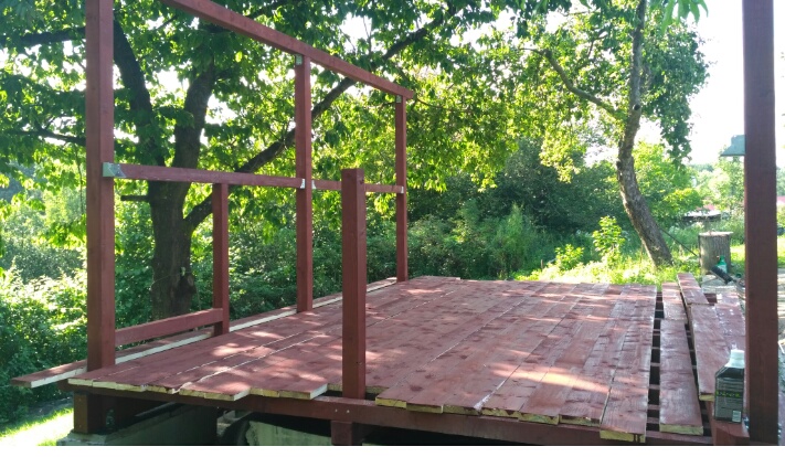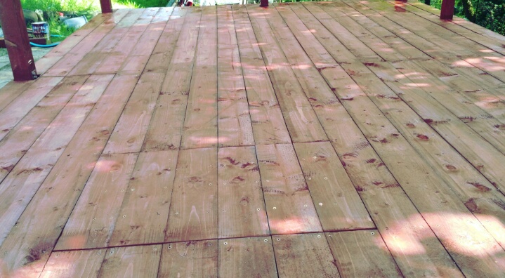 Z píly sú ešte mokré ako hnoj, s kľudom podlahu dotiahni na doraz, klínmi alebo heverom. Na záver podlahu napusti vriacim ľanovým olejom aplikovaný na pravé poludnie, aby olej zatiekol medzi spoje. Nechaj olejom nacecať fošne, časom prebytočný olej dosky vcucnú. Smrek je papír, to nie je drevo určené do exteriéru. Z ihličnanov jedine borovica, obsahuje živice, drevo je mastné a prirodzene chránené proti škodcom, hubám, plesniam a sčasti proti vlhkosti.