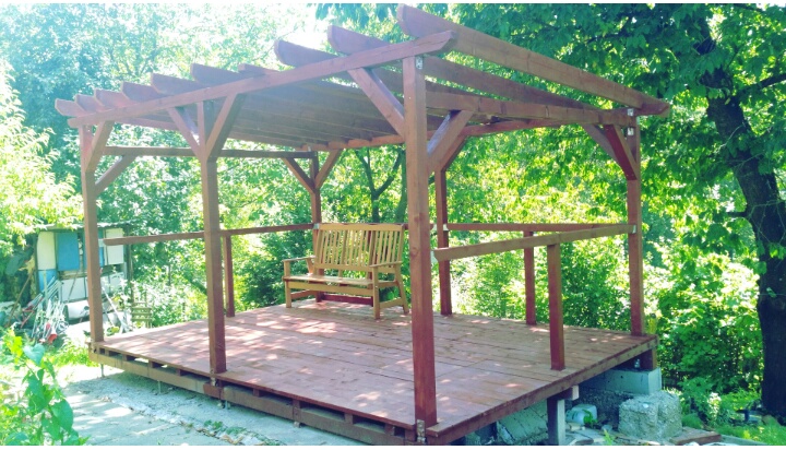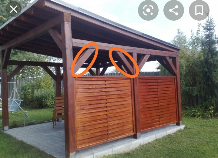 Dřevěné spoje mezi šikminou a trámkem spoj lepidlem na dřevo. Už nevím, jaké bylo označení. Tuším že D2, nebo D9. Šikminy jsem svrtal tesařskými vruty 8mm tlustými :D a dal 3 na každý spoj(asi by stačil jeden, nebo 2)+to lepidlo. Nejsem zkušený tesař a tvořič pergol. Jestli jsem dal 500kč za vruty+lepidlo navíc, tak to beru jako lepší cena, než se stydět před sousedy, kdyby se mi to složilo pod náporem sněhu a krutých větrů, které tu sem tam foukají i v zimě. Navíc to mám obehnáno palubkami+plachtami, takže se má vítr do čeho opřít.