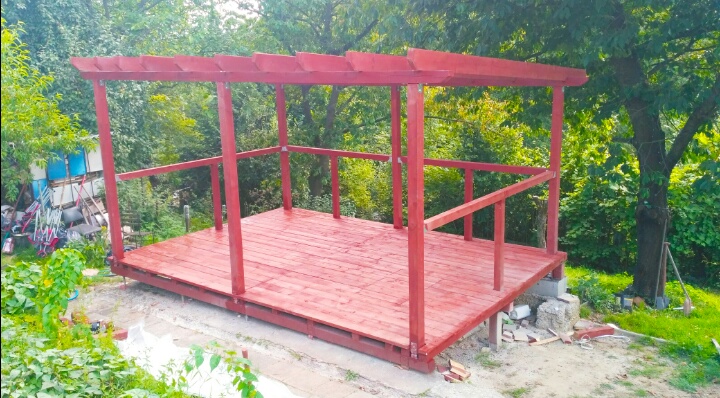 Jsem rozhodnutý to tam dát. Každé 5m prkno bude držet na 12 vrutech 5x80 mm. Dám to teda na doraz. Snad to vydrží. ? Tady je moje dílo. Na to ,že jsem to dělal sám tak mi střecha ujíždí jen 3cm ?? spotřeba zatím 17 l luxolu. ?? Cena jen za dřevo 11000 bez střechy. ? Střechu počítám tak 6000.OSB+kvalitní lepenka. Celkem tak 23000-25000 svépomocí. Práci čest!!