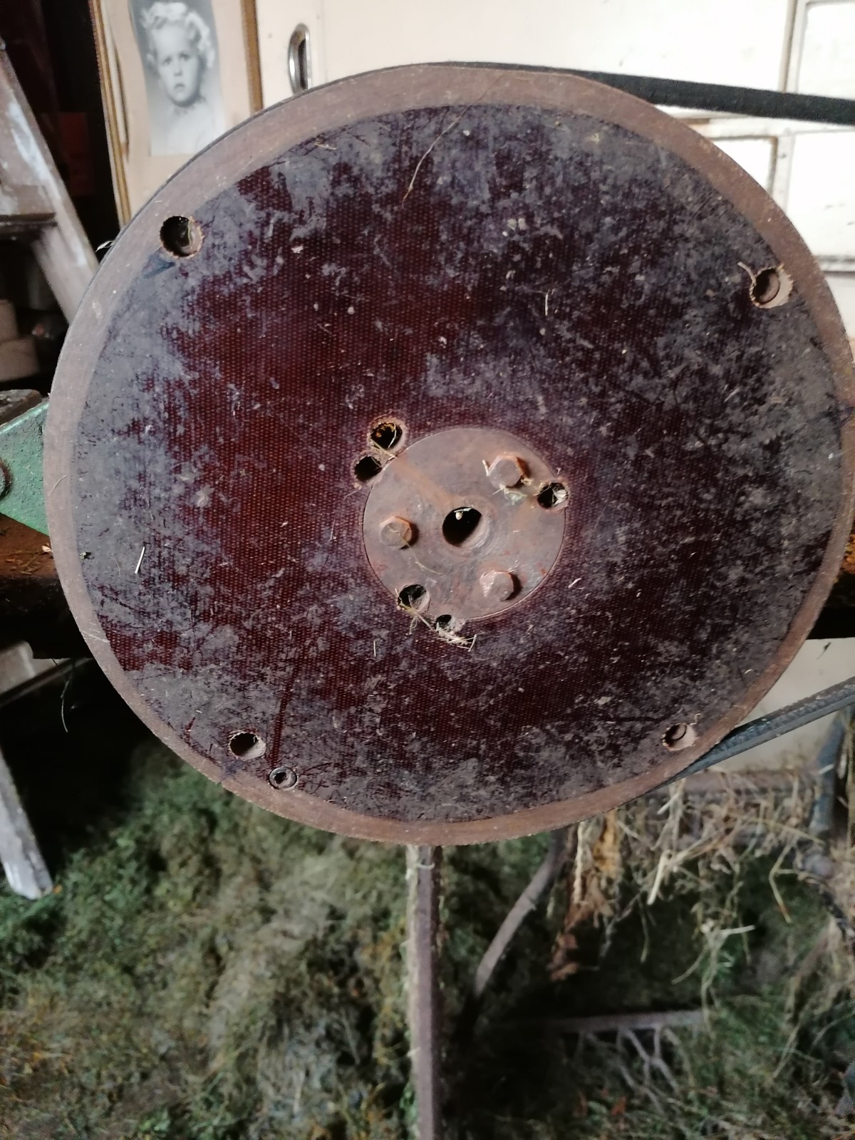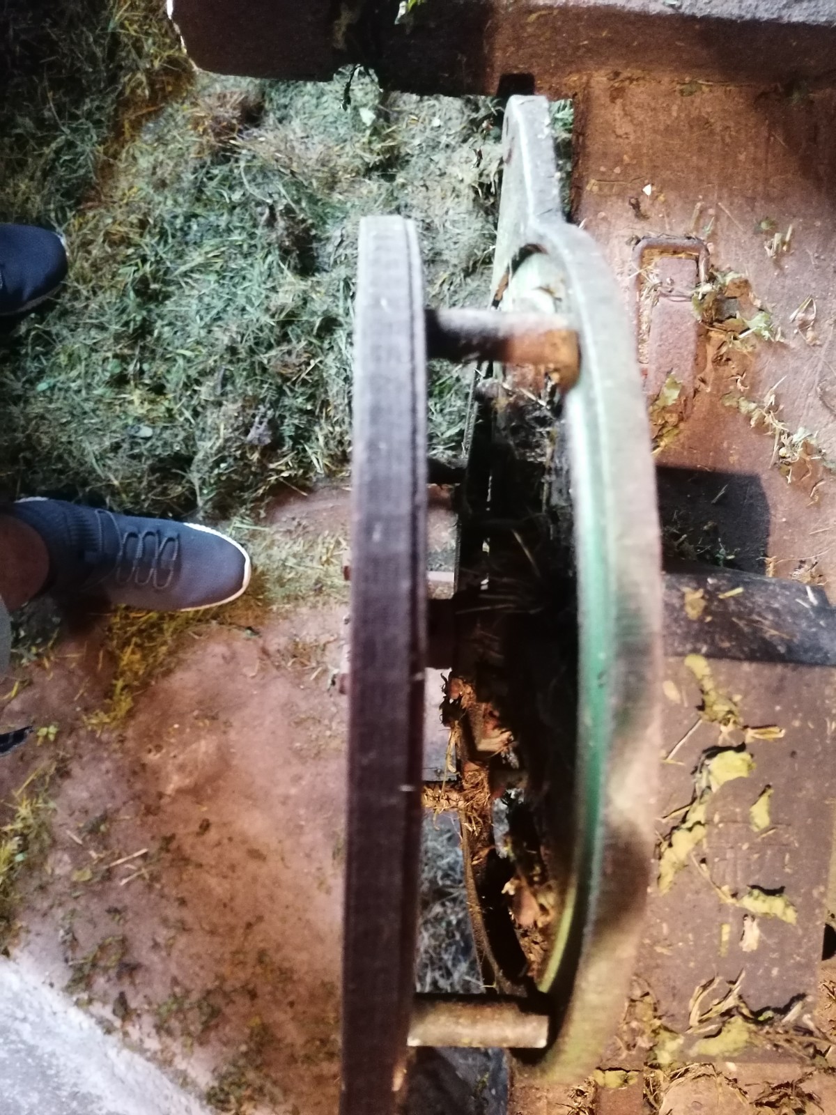 Řemenice má velikost kola na ruční pohon a je k němu přišroubovaná 7 šrouby přes odsazení z kovové trubičky. Tím, že je plná, brání rozhazování trávy všude. Ale tráva se občas tlačí zpět.