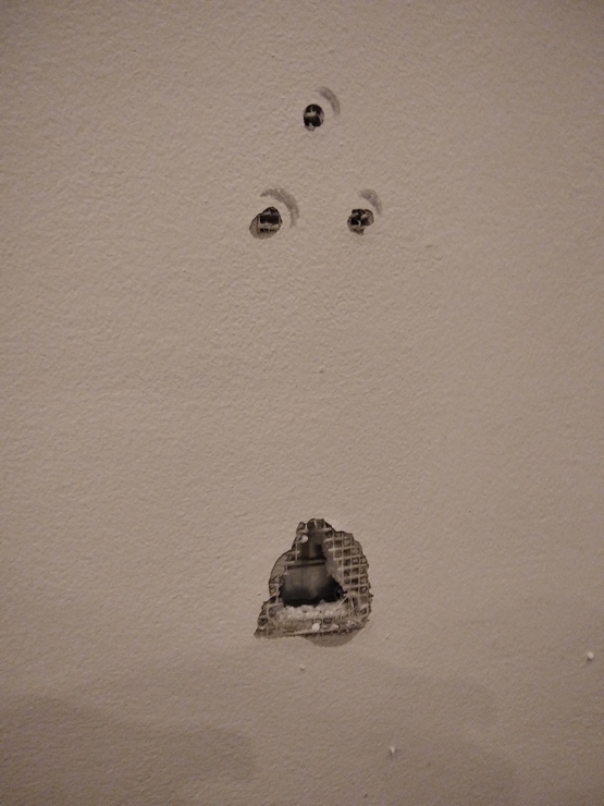 Nacpi do diery a za touto dierou vzniknutého medzipriestoru pištoľou v tube nejaké stavebné lepidlo, masu hmoty, aby sa za perlinkou a ostatným bordelom v podobe Potemkinovej dediny roztiekla, podlepila z vnútroštátnej strany plochou cca 20cm2 (hmota vytvorila koláč), do ktorého ešte v plastickom stave zasuň bežné hmoždinky na príslušné skrutky, počítam s priemerom hmoždíniek cca 10mm. Dúfam, že natlačená hmota z pištole sa v dutom priestore udrží nalepená na zadnej a prednej stene a nezosype sa vlastnou tiažou dole, do medzipriestoru.