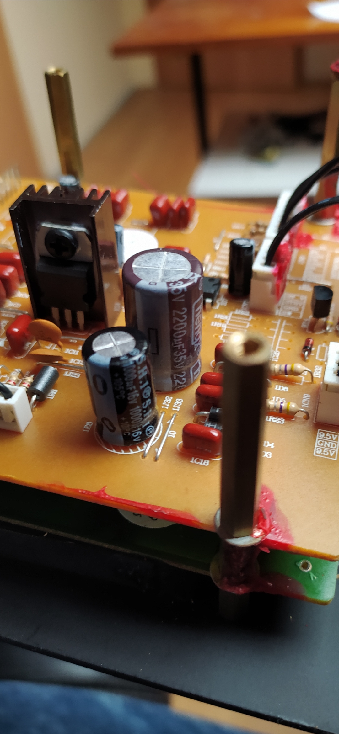 Jaký kondenzátor tam dle vás mohl být? Můj odhad je 25V a 3500uf, tyhle čísla mám v hlavě. Na obrázku je to ten hnědý (to je ten náhradní).