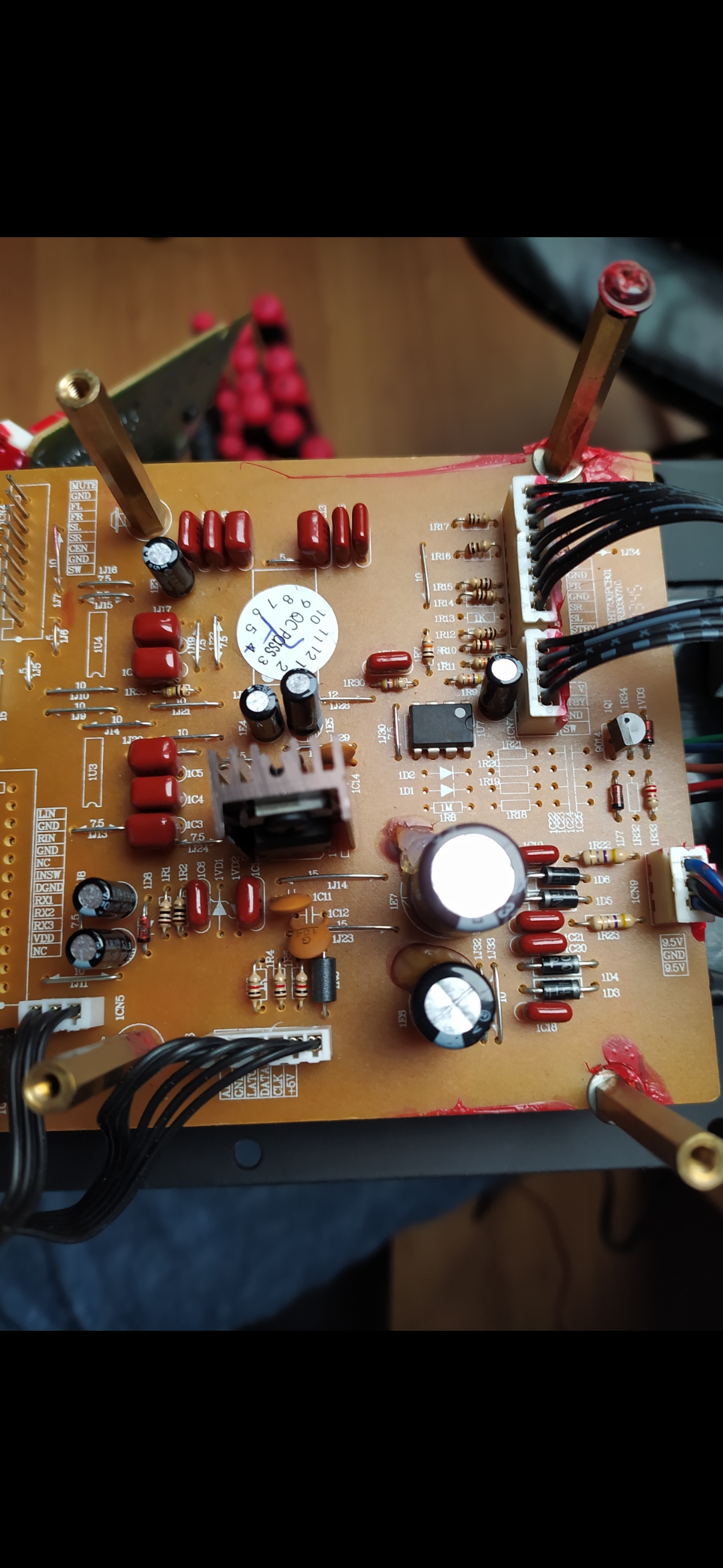 Dnes jsem kino opět rozebral, prozkoumal a fotku předchozího kondenzátoru jsem si samozřejmě nepořídil. Kondenzátor se nachází u vstupu a výstupu zvuku.