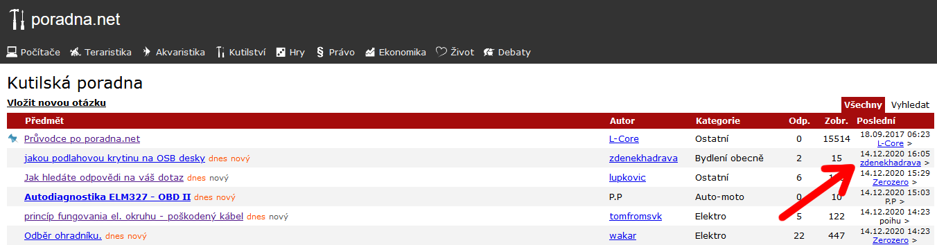 Na PC stačí v seznamu témat: https://kutilska.poradna.net/ kliknout u daného tématu na datum posledn…