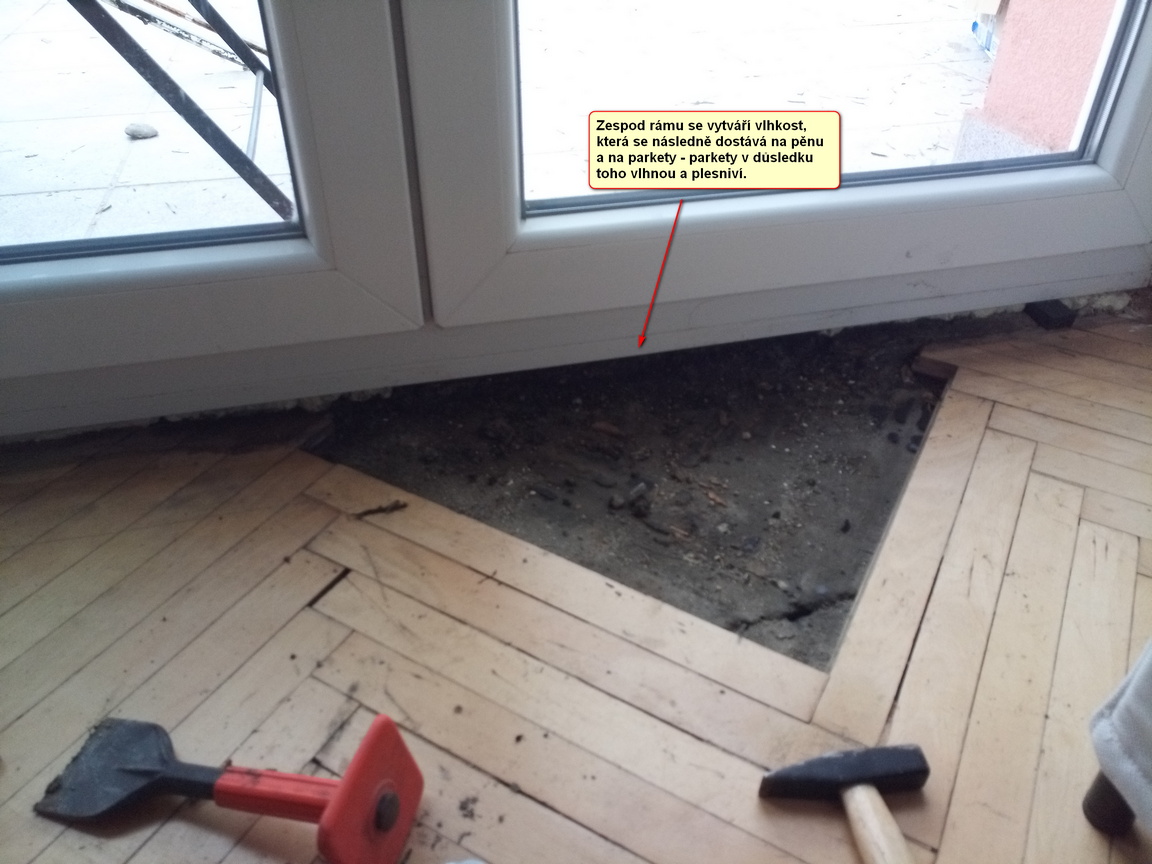 v cca 100 let starém domě jsme dva roky nazpět rekonstruovali balkon a vyměnili balkonové dveře. Okna se mírně rosí, což není problém otřít, část vlhkosti se však dostává i na práh. Při pokusu o jeho výměnu/přelakování jsem po odstranění prahu zjistil, že vlhkost částečně zasáhla i parkety pod prahem a hlavně, že se sráží také zespod rámu, v němž jsou dveře usazeny. Montážní firma rám de facto jen položila na konec parket, podložila a vyplnila pěnou, která tím pádem taky navlhá a přes kterou se vlhkost dostává dál (na parkety).