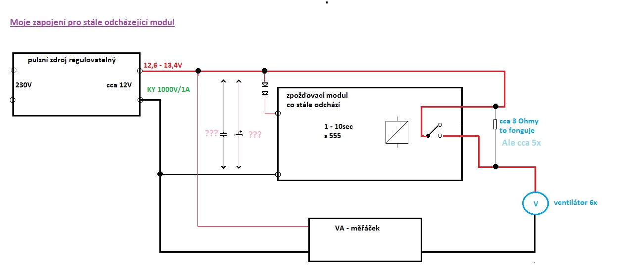Moc Děkuji…..zenerky jsem zatím nehledal a nejsem si jistý, že bych správně spíčítal předřadný odpor, protože modul odebírá podstatně míň když zpožďuje a pak mnohem víc, když přitáhne relé. Už to řeším s 7812 a už tu mám připravené i blokovací koďany 0,33 a 0,1 . Zároveň dám do modulu i paralelně k cívce, ale to mi přijde už jako blbost. Výrobce to musí vědět a spínací tranzistor tak musí chránit. Bohužel v modulu jsou jen plošné součástky, tak se v tom nedá moc vyznat!!!!. Jestli tohle vše nepomůže (v úterý mi přijdou nové dva moduly……a z Ebay 5ks až za měsíc) tak dám ještě KY 6A do výstupu pro ventilátory. M.