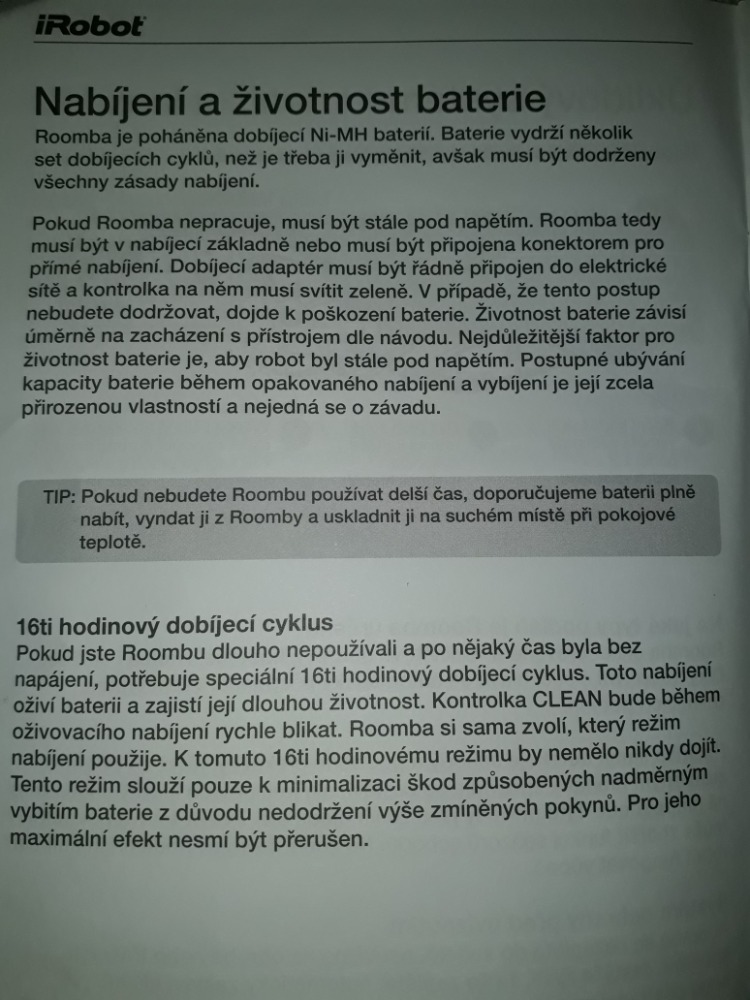 A většinou všechny tyhle vysavače jsou řešeny tak, že vysavač by měl být stále usazen na dokovací stanici a zapnutý (v pohotovosti, aby mohl programově vyjíždět). Po vybití baterie na kapacitu cca 5-10% přestává pracovat a "hledá" dokovací stanici, kde se sám "usadí" a opět se sám nabíjí. Po nabití se nabíjení baterie samo přeruší až do doby dalšího vyjetí. Přitom se vysavač vůbec nevypíná hlavním vypinačem.;-)