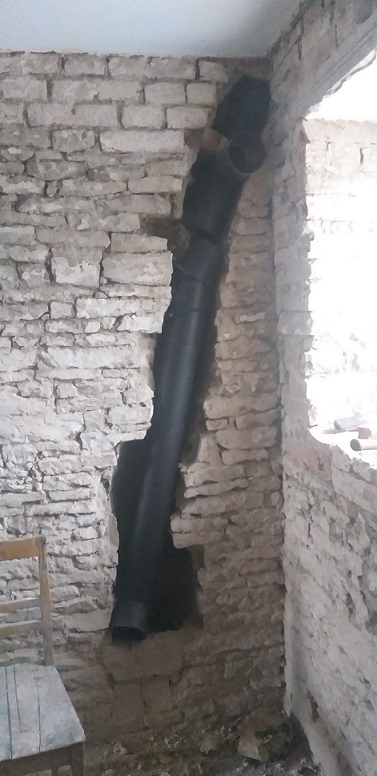Ve staré části domu jsem se rozhodl vytvořit dílnu a chtěl jsem použít starý komín na připojení kamínek. Stará část domu je postavená z opuky a jelikož stěny byly vlhké a omítka poškozená, celou kromě stropu jsem jí oklepal a nechám to tak, aby to větralo. Izolace tam totiž žádná není a bude to jen dílna.