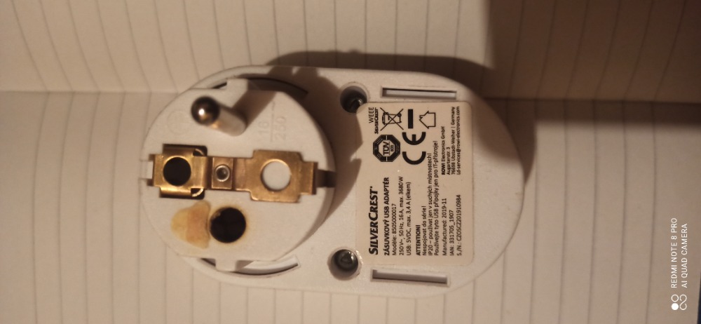 Myslím, že v tomhle případě za to asi ani ten adaptér nemůže. Na štítku je max proud 16A, což je standard a topení bere asi 10A, což je častý důvod vypálení už horších zásuvek. Kontakty v zásuvce jsou už uvolněny a špatně doléhají na kolík (jiskření).