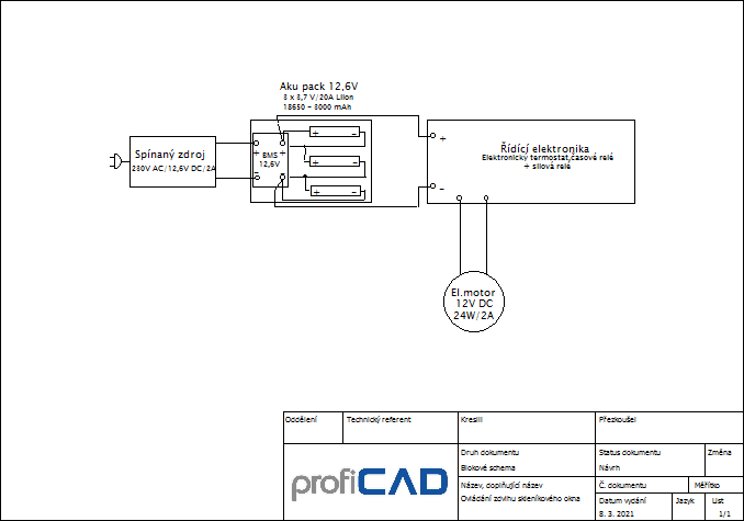 Pro napájení elektroniky (cca 250mA) není problém, ale vzhledem k tomu, že při odzkoušení přímého napájení tímto spínaným zdrojem 12,6V/2A, dochází při zapnutí pohonu k většímu záběrovému proudu, který není schopen tento spínaný zdroj zajistit a dochází k výpadku, chci tento nedostatek vyřešit paralelním připojením menší akubaterie 12V, jež by byla tímto zdrojem rovněž stále dobíjena.