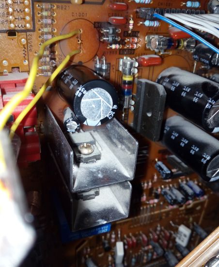 Po výměně ovšem zvuk nejde vůbec, navíc jsem zjistil že se brutálně hřeje dvojice výkonových tranzistorů na plechových chladičích v bezprostřední blízkosti měněného kondenzátoru.