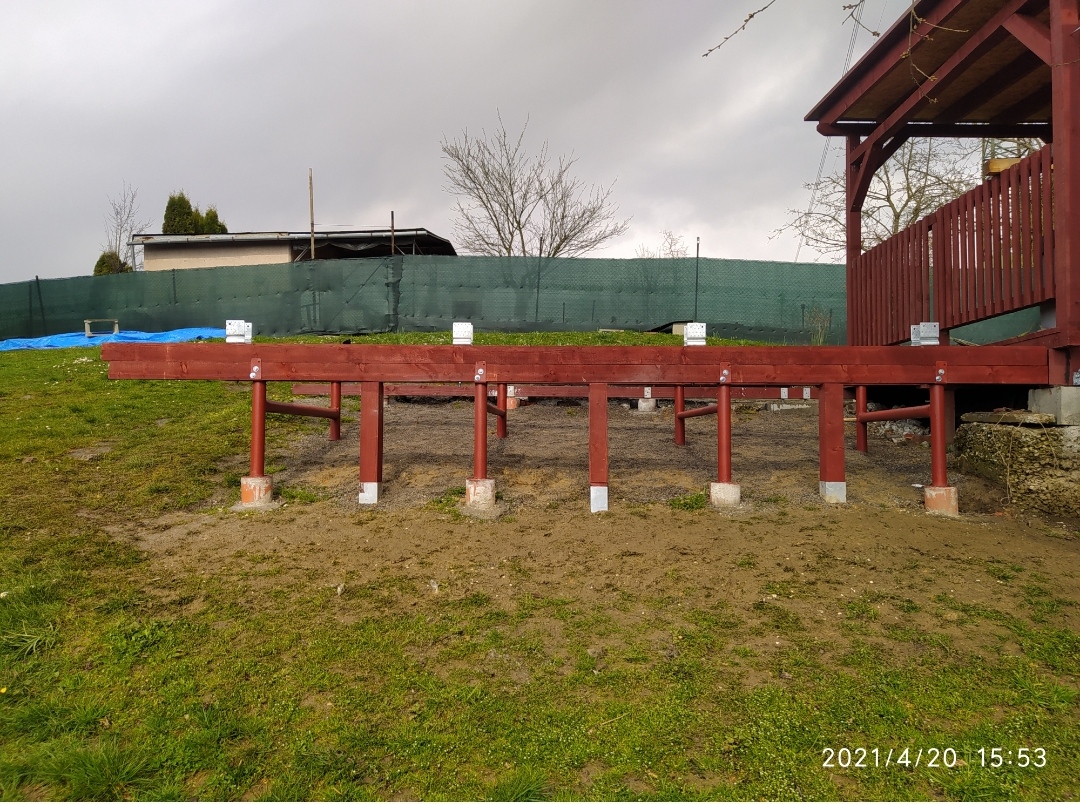 Dobrý den, prosím o vaše názory.Unese to zahradní domek 4.7x3.2m v mírném svahu???Trubky 70x4mm zabetonované do patek 200mm a hloubky 800mm.Trubka je taktež napěchovaná betonem a zakončena kotvou. Doplněno 3ks zatloukacich pátek a hranolem. Bude to ještě svázané 9 ks hranolu 80x80mm a na to fošny 30mm .Děkuji