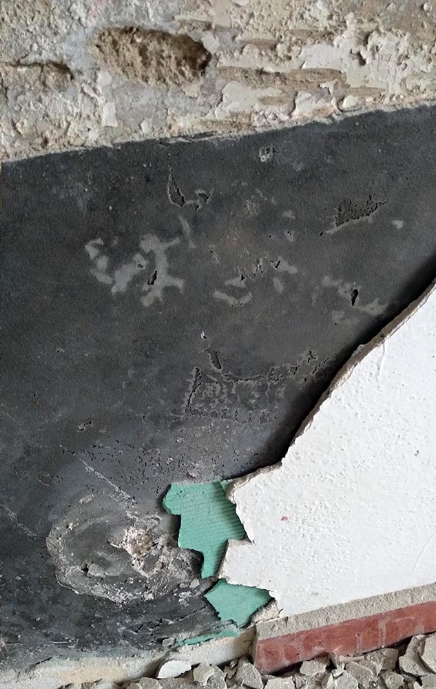 Pomáham v jednom staršom dome obýjať omietku a pod omietkou sme našli toto, čo je to? Myslím to zelené a to čierne na stene...?