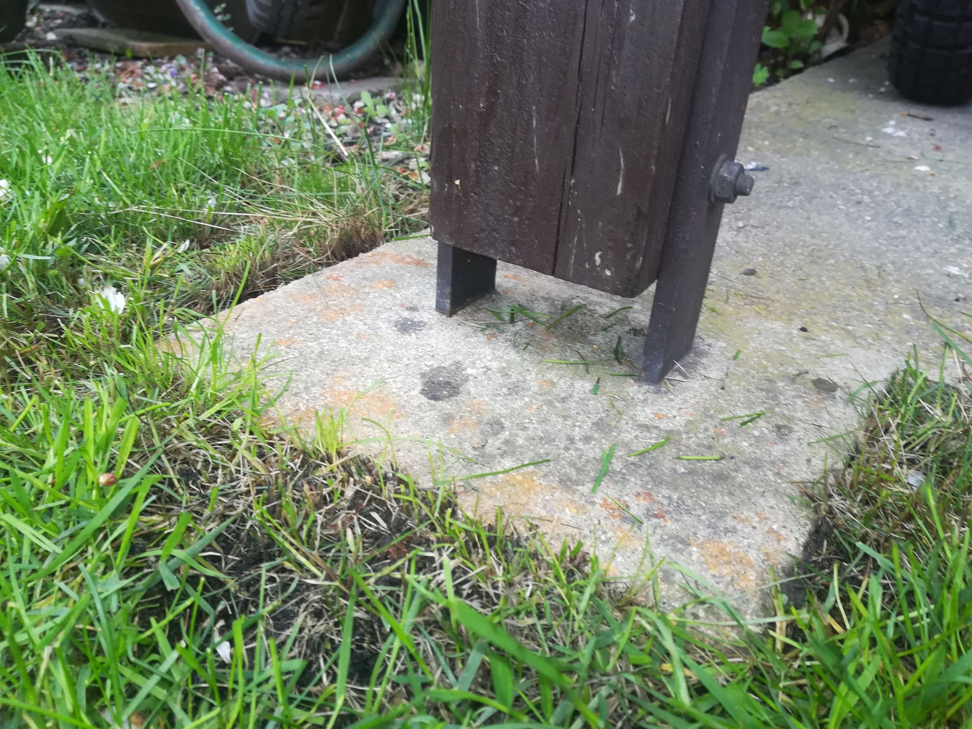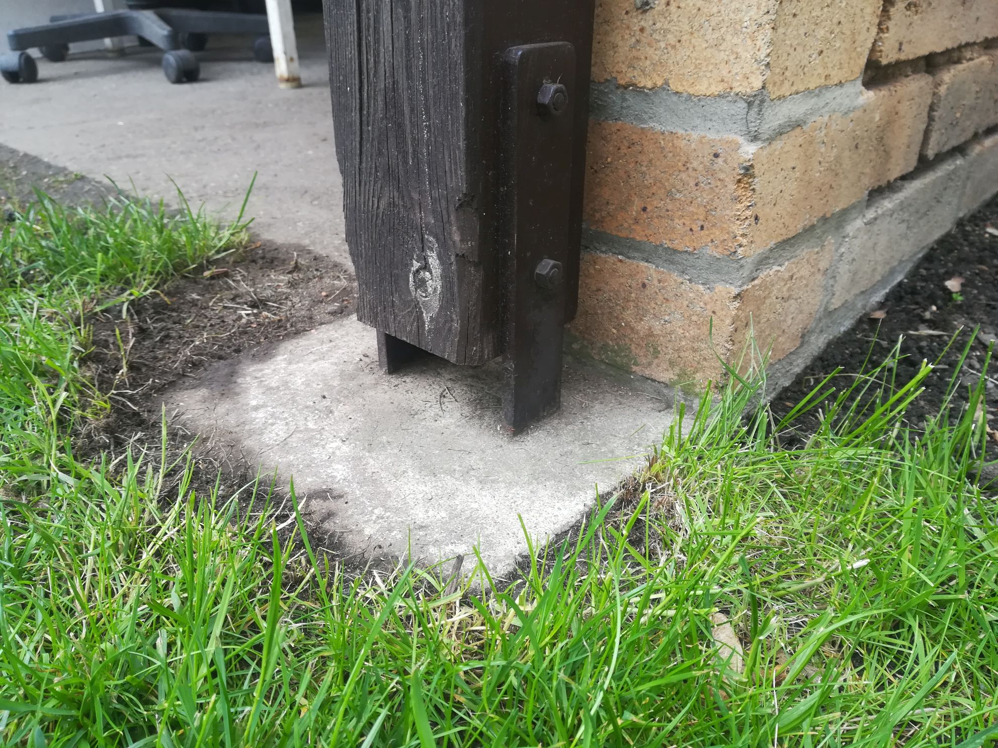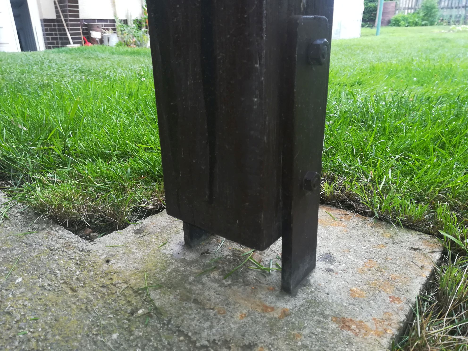 Já mám taky šrouby s matkou (2 ks asi M10) skrz. A spodek sloupku cca 1 cm nad patkou, aby nevlhnul a neuhníval.