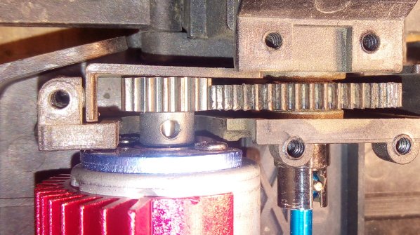 Viz předmět. Starý motor zhořel, pastorek byl taky úplně omletý, tak jsem to vše vyměnil a tento převod je zdrojem velkého hluku. Normálně je ještě zakrytý krytkou, nemaže se to nějakou vazelinou nebo tak?