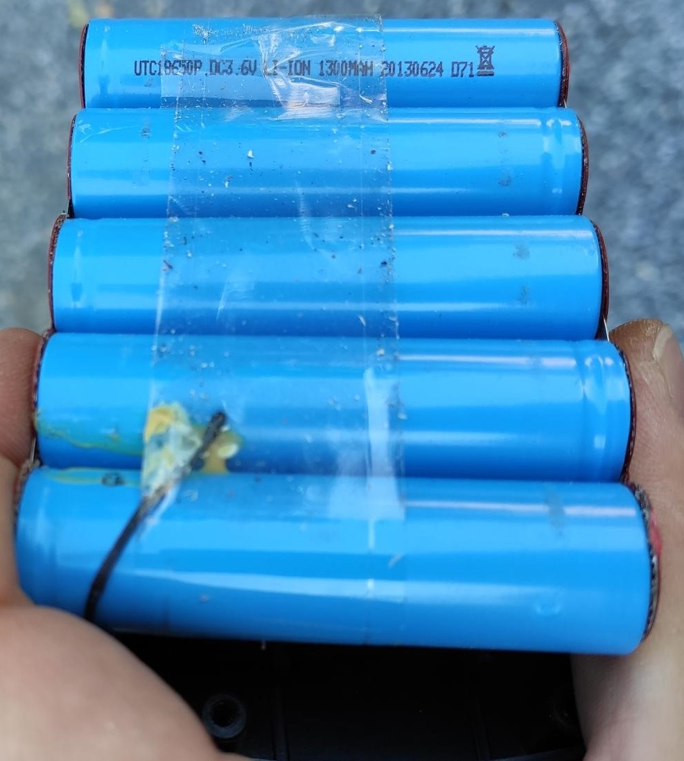 Uvnitř akubloku se nachází 5 článků 3,6V 1300mAh, akumulátor je deklarován jako 18V. Akublok je třívývodový, ale jak jsem psal, k nabíječce i vrtačce se připojuje jen červeným a černým, tedy plus a minus.