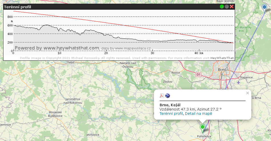 Tip: vpravo nahoře si můžeš přepnout mapu (ikonka 3 čtverečky na sobě) z topografické na fotomapu. A při vhodném měřítku (přiblížení mapy) vidíš přímku mezi bydlištěm a vysílačem, tedy přesný směr, kterým máš nastavit anténu. Např. směrem na jakou budovu, boid v krajině a podobně....