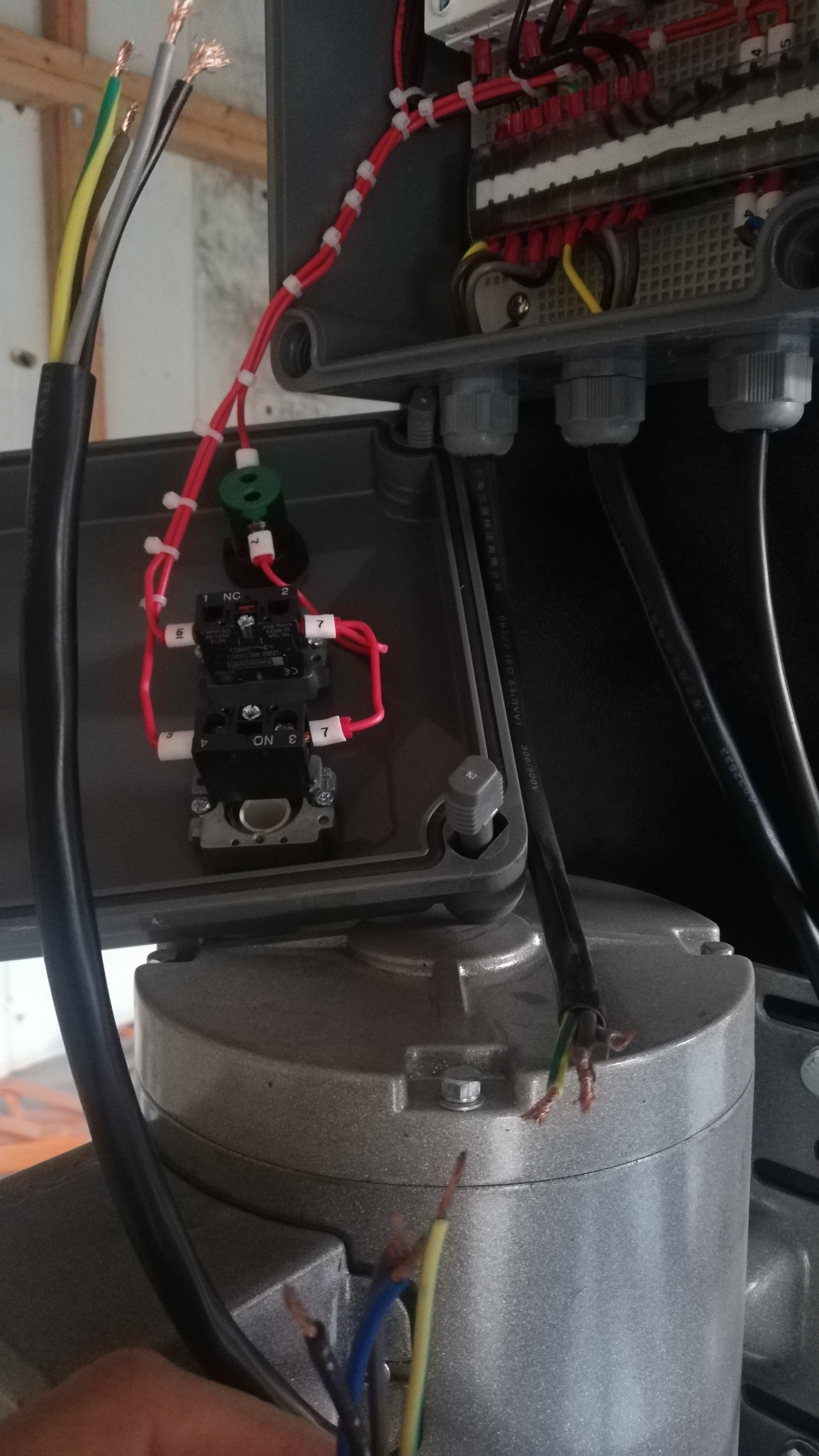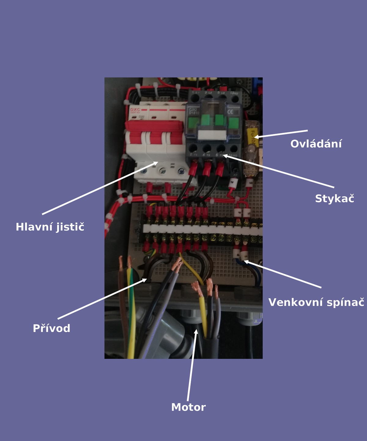 Kabel v pravo vede na stykač, což je ovládací prvek motoru. Tedy tento kabel připojit na motor.