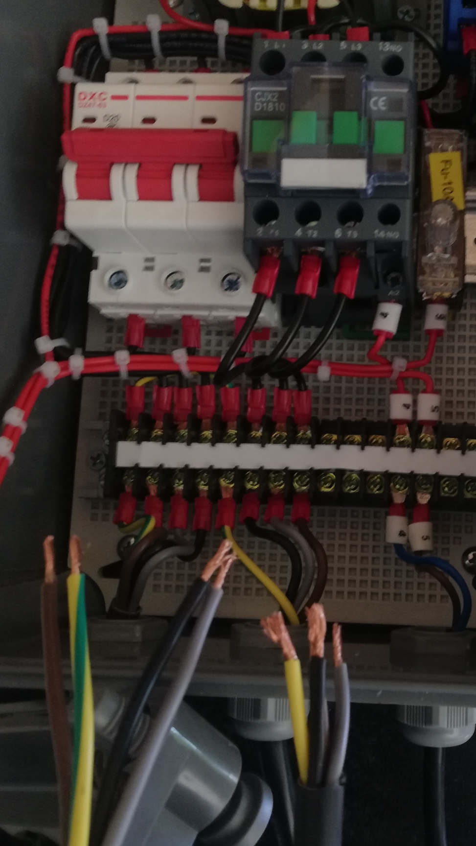 Kabel v pravo vede na stykač, což je ovládací prvek motoru. Tedy tento kabel připojit na motor.