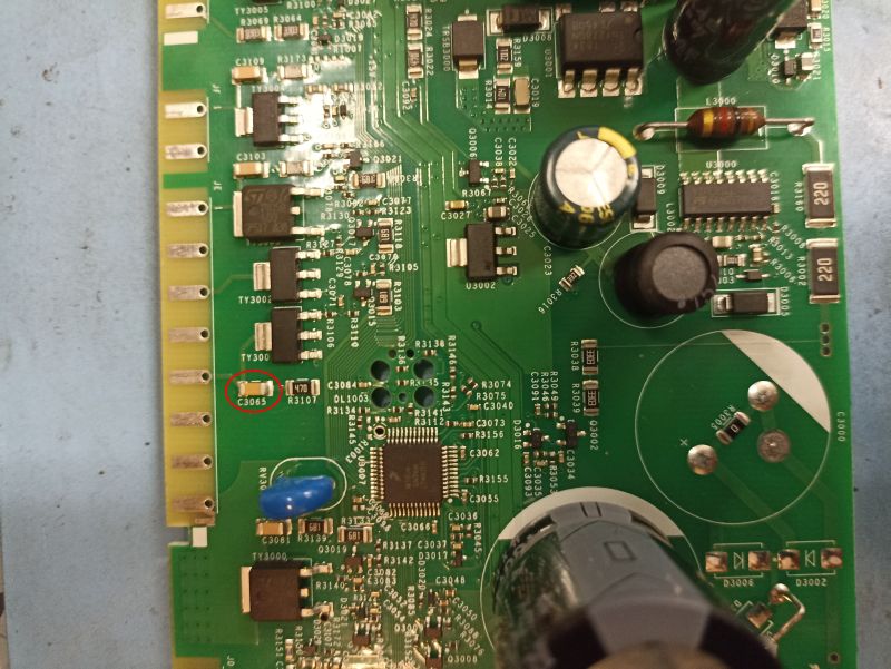 Ventil napouštění/Aquastopu je spínán triakem TY 3001 (typ Z0103MN). Mezi anodami triaku naměřeno cca 516 ohmů. Podezření na vadný triak. Po výměně triaku opět naměřen odpor 516 ohmů. Dalším bádáním zjištěno, že k triaku je paralelně připojena sériová kombinace odporu 47 R (R3107) a kondenzátoru 10 n (C3065). Naměřen svod v kondenzátoru (cca 470 ohmů – to stačilo k otevření ventilu).