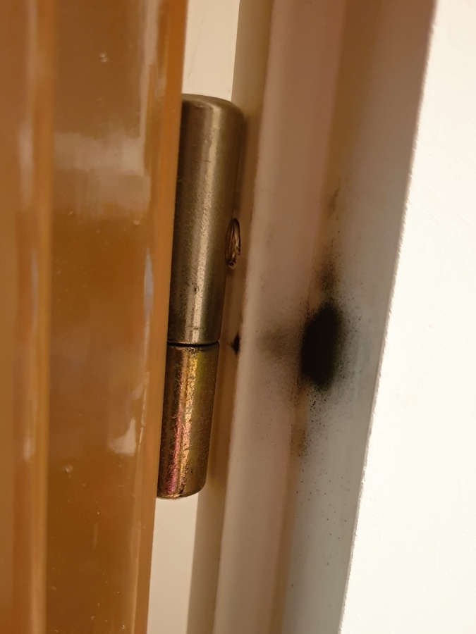 Dobrý den, mám problém, že u několika interiérových dveří v bytě dochází ke špinění dveří u dveřních závěsů - viz foto. Je to jemný mazlavý černý prach. A hodně špiní. Co mohu udělat pro to, abych se tohoto neduhu zbavil? Nevyskytuje se to na všech dveřích, ale jen na některých. A když už se to vyskytne, tak je to vždy u všech třech závěsů na dveřích.