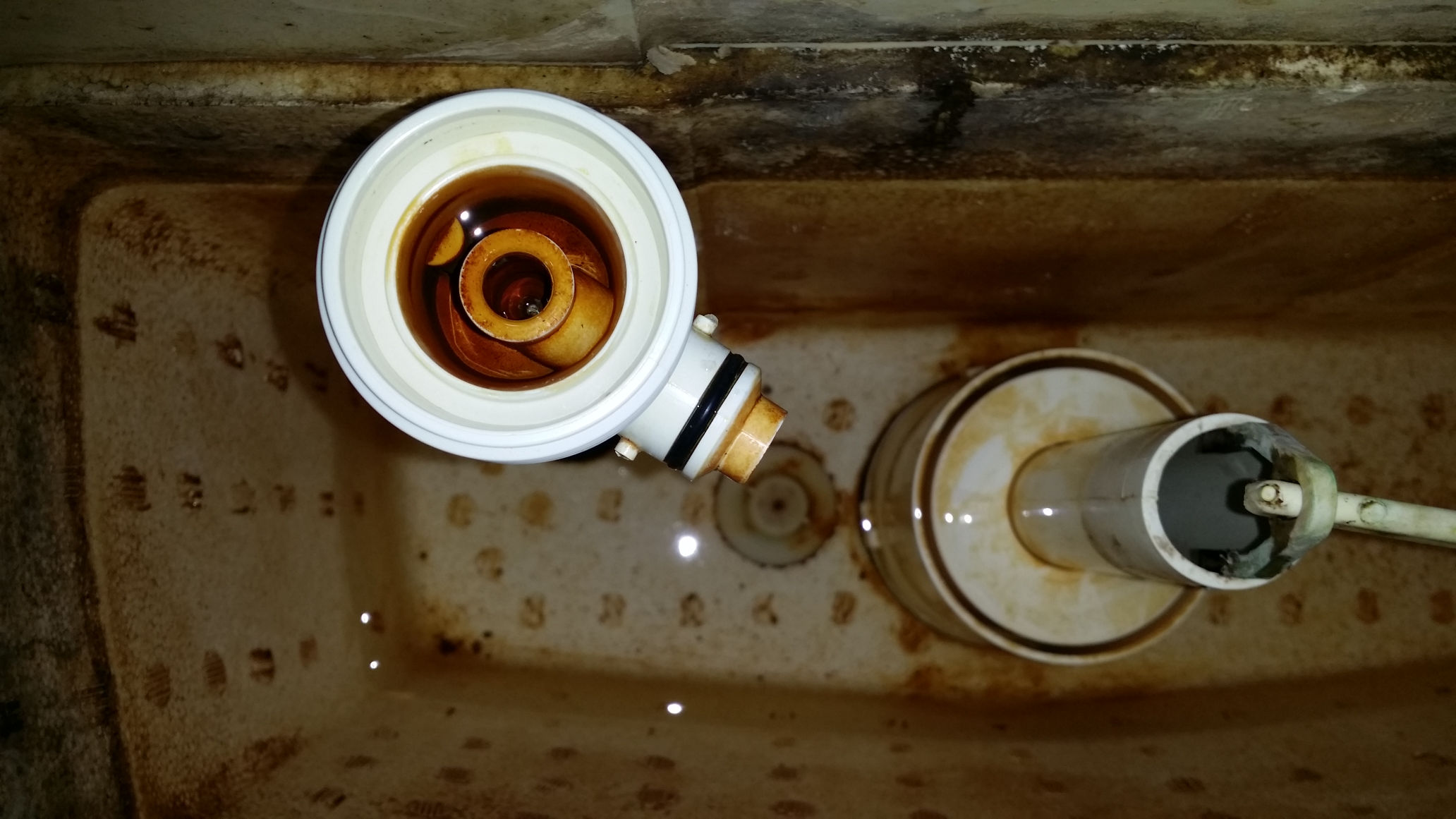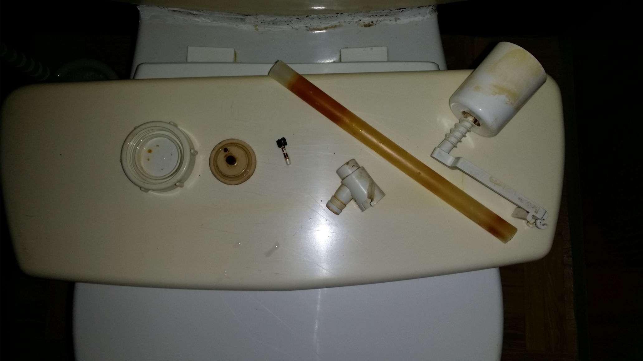 Rozebral jsem to, přemýšlel jsem nad tím a zjistil jsem, že to nedávám, nemůžu přijít na princip toho záchodu. Je mi jasné, že plovák má zvednout ten malinký špendlík uprostřed na třetí fotce a pak to má nějak zabránit vodě téct, ale nevím jak, zkoušel jsem to, jak jsem mohl, ale vždycky je tam díra a logicky teda voda teče. Nic v záchodě nebylo rozpadlého, nic jsem neztratil, ani nebylo jak. Začal jsem se do toho hrabat, až když to začalo téct. Nevím.