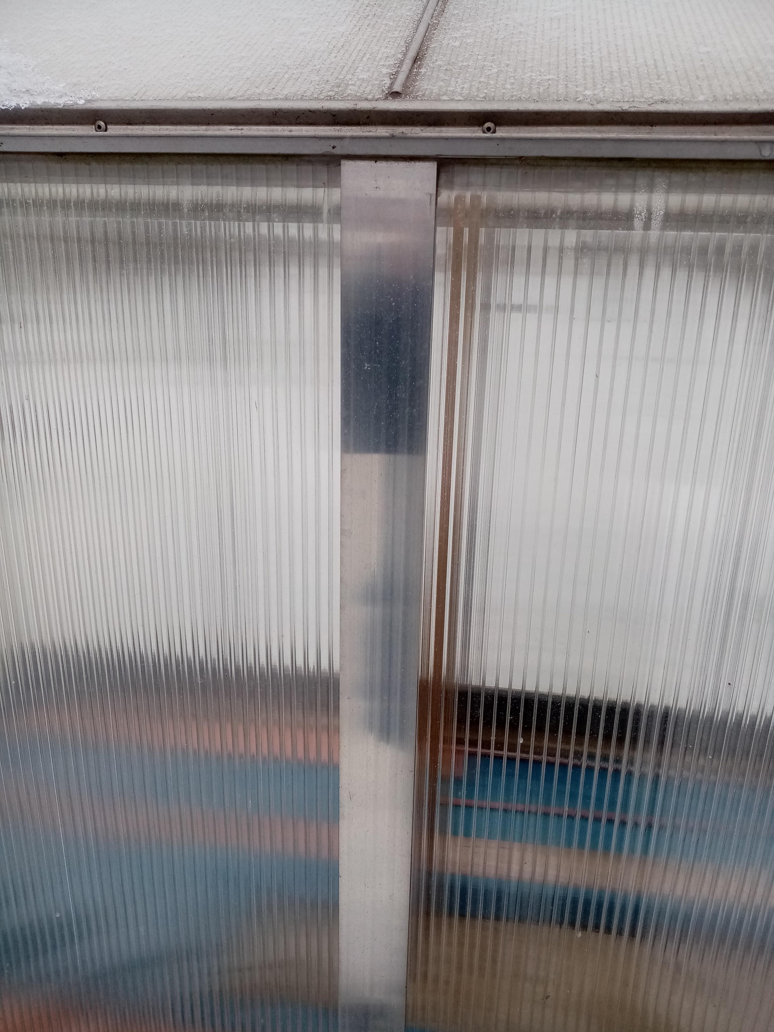 Na boční polykarbonátové stěně skleníku, stojící na betonovém soklu se projeví vlhkost ze sněhu padajícího ze střechy a tak jsou v zimě dolní okraje desky pár centimetrů až půl metru pod sněhem, když roztaje, voda vyteče ale v komůrkách se hned na jaře dělá ta zelená vrstvička. Na velké ploše to nevadí, není to hned vidět, ale na malých a dobře viditelných místech si toho každý všimne.