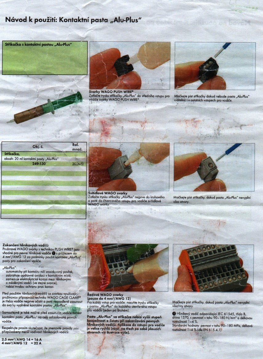 U té pasty jsem alespoň já dostal papír psaný v němčině (stejný se dá stáhnout v pdf ze stránek firmy wago, no koukám, že to neni tak jednoduché, ale když jsem zjišťoval informace, tak kromě několika mnohasetstránkových katalogů jsem našel i toto, ale prostě to teď nenacházim). Tam bylo, co dovede, ale už ne jak ji aplikovat. Ani jsem nenašel zmínku o její vodivosti či nevodivosti (tedy jestli vadí, když ji někde vybryndám). Taky jsem z toho byl trochu bezradný, tak jsem to prostě nějak udělal, jako to je na obrázcích. Pasta má chránit proti přístupu vzduchu (svorky jsou měděné, tak aby k tomu nemohl) a taky má z vodiče odstranit vrstvičku oxidu. Jak je to udělané, aby netvořila bariéru mezi vodičem a svorkou nevim, asi ji prostě ta svorka vytlačí. Natlačil jsem tedy z té stříkačky do díry, co se vešlo a pak strčil vodič. Ale předtím doporučuju zkusit nasucho (pokud máte wago s páčkou, jinak to nejde), jestli ten vodič zapadne dost hluboko (až nadoraz), abyste nedopadnul jako já (a já na to přišel docela včas, tím že jsem nevěděl čím se zabavit, než proschne sádra, tak jsem pouštěl do drátů proud; jen domýšlím, co bych musel podstoupit, kdyby to byl ten zasádrovaný (nastavení vodiče ulomeného zhruba v úrovni krabice) a ne ta svorka, co je navrchu, ale pořád by bylo dobré přijít na to, dokud je to rozkopané nebo čerstvě zasádrované než aby to vyhořelo třeba za rok).