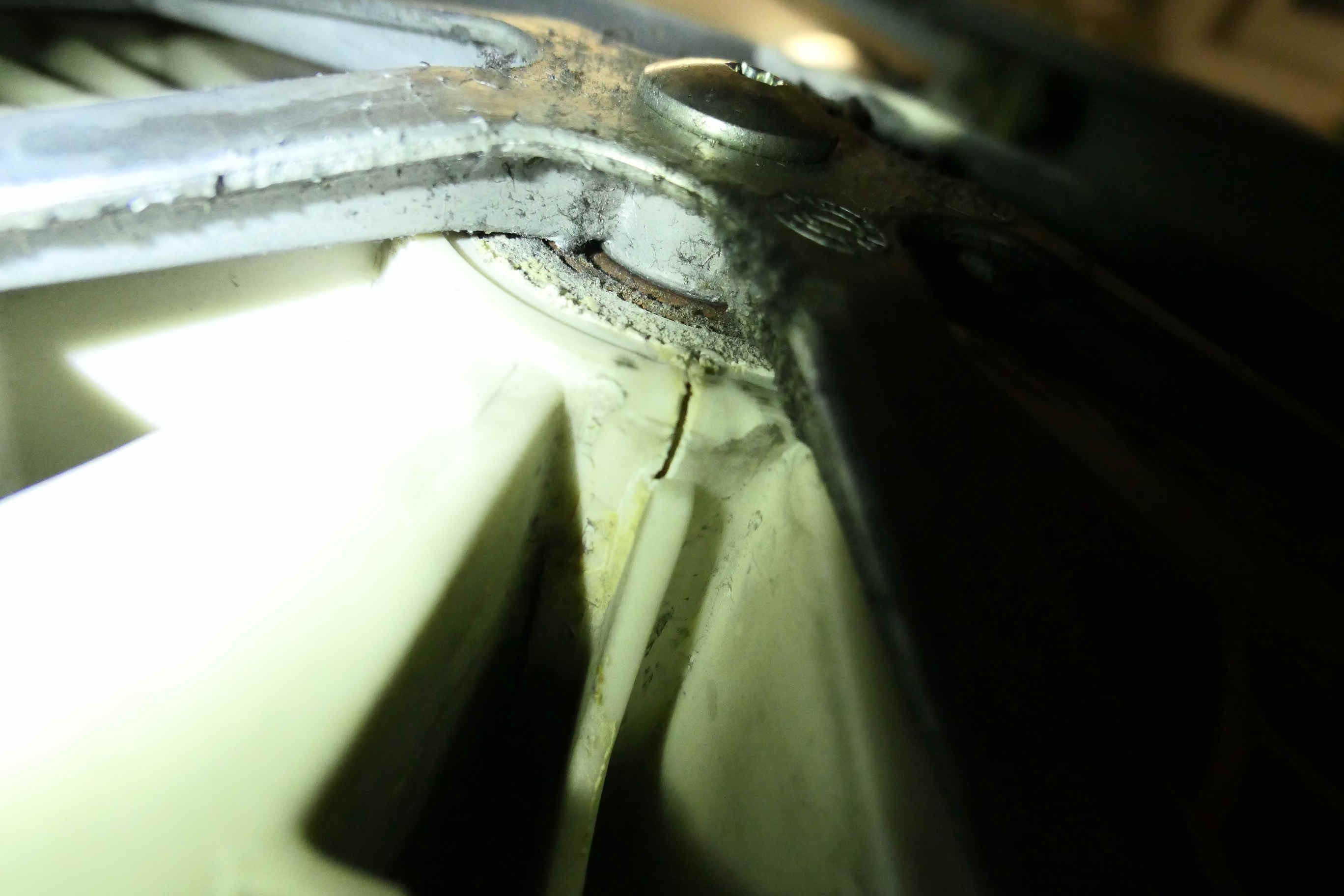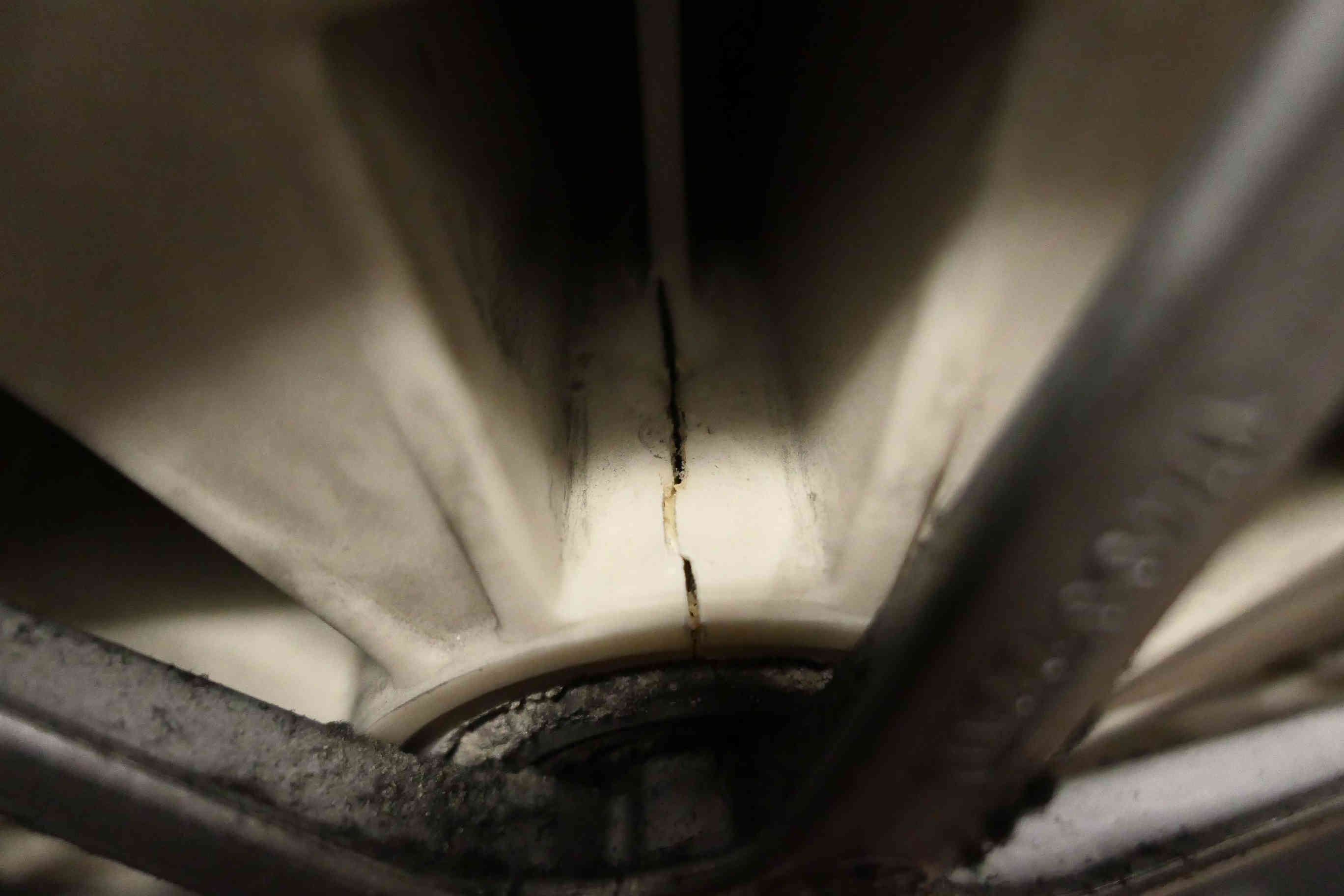 Ale podíval jsem se kryt bubnu pořádně. U ložiska. Z vrchu a zespodu jsou praskliny. Viz.obrázky. Jedna je z hora, druhá prasklina je o 180° naproti(zespodu).