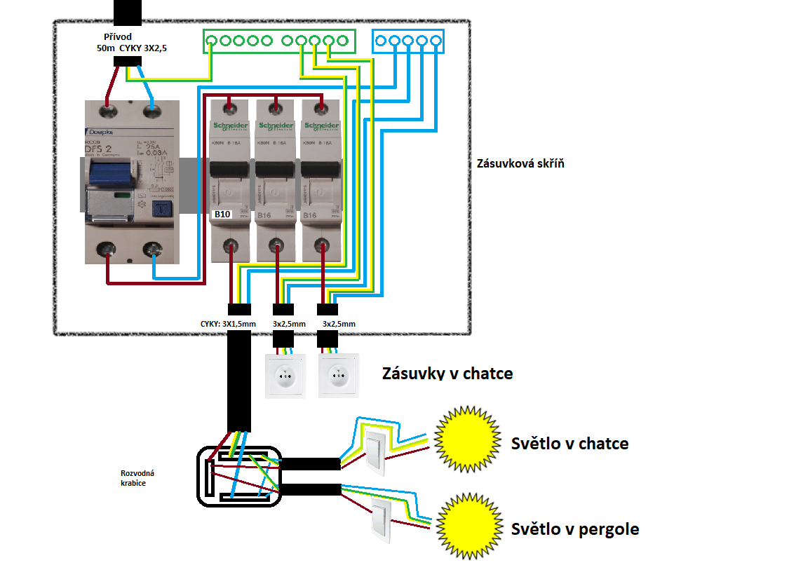 Ale pokud je přívod délky 50 m a uvažujete o CYKY 3 x 2,5, v případě že bude na zásuvkách větší proudové zatížení, případně třeba až v maximální hodnotě jističe přívodu (předpokládám že asi 16A) tak bude na rozvaděči, zásuvkách a spotřebičích pravděpodobně dost velký úbytek napětí. Což by zřejmě neodpovídalo požadavkům ČSN (max. cca 5%). Může se pak projevovat třeba, při zapnutí várné konvice, vařiče, nebo el. topidla, poklesem svítivosti zapnutého osvětlení a částečným snížením výkonu konkrétního spotřebiče. I když, pokud se jedná o takto "podružnou" záležitost (pergola, chatka), je to na vás. ;-)