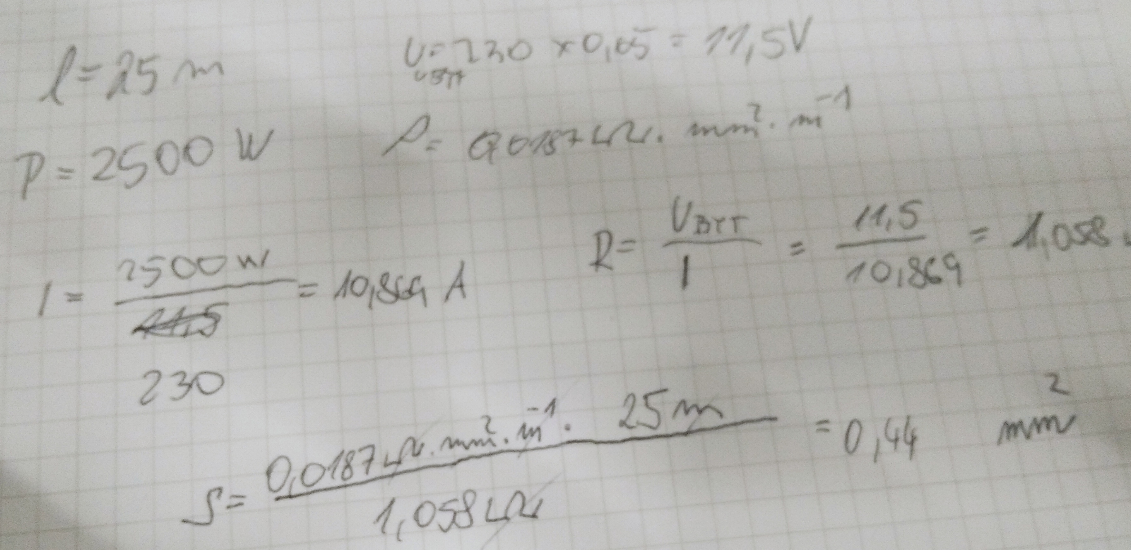 Proč něco počítat? Průřez 1,5mm² můžeš jistit max. 12A. Průřez 2,5mm² můžeš jistit max. 16A. Při příkonu 2,5KW si můžeš vybrat. Můžeš zohlednit ještě kudy kabel povede, kvůli ochlazování (ve zdi, v trubce, v zemi, volně,...)