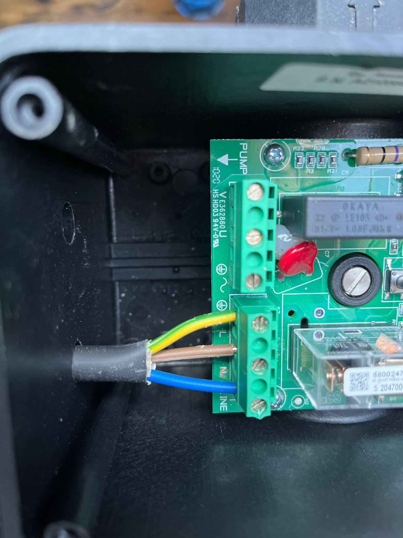Svorka C - > L čerpadla (hnědá); Svorka A - > N čerpadla (modrá); Svorka PE -> PE; Je to tak? Díky