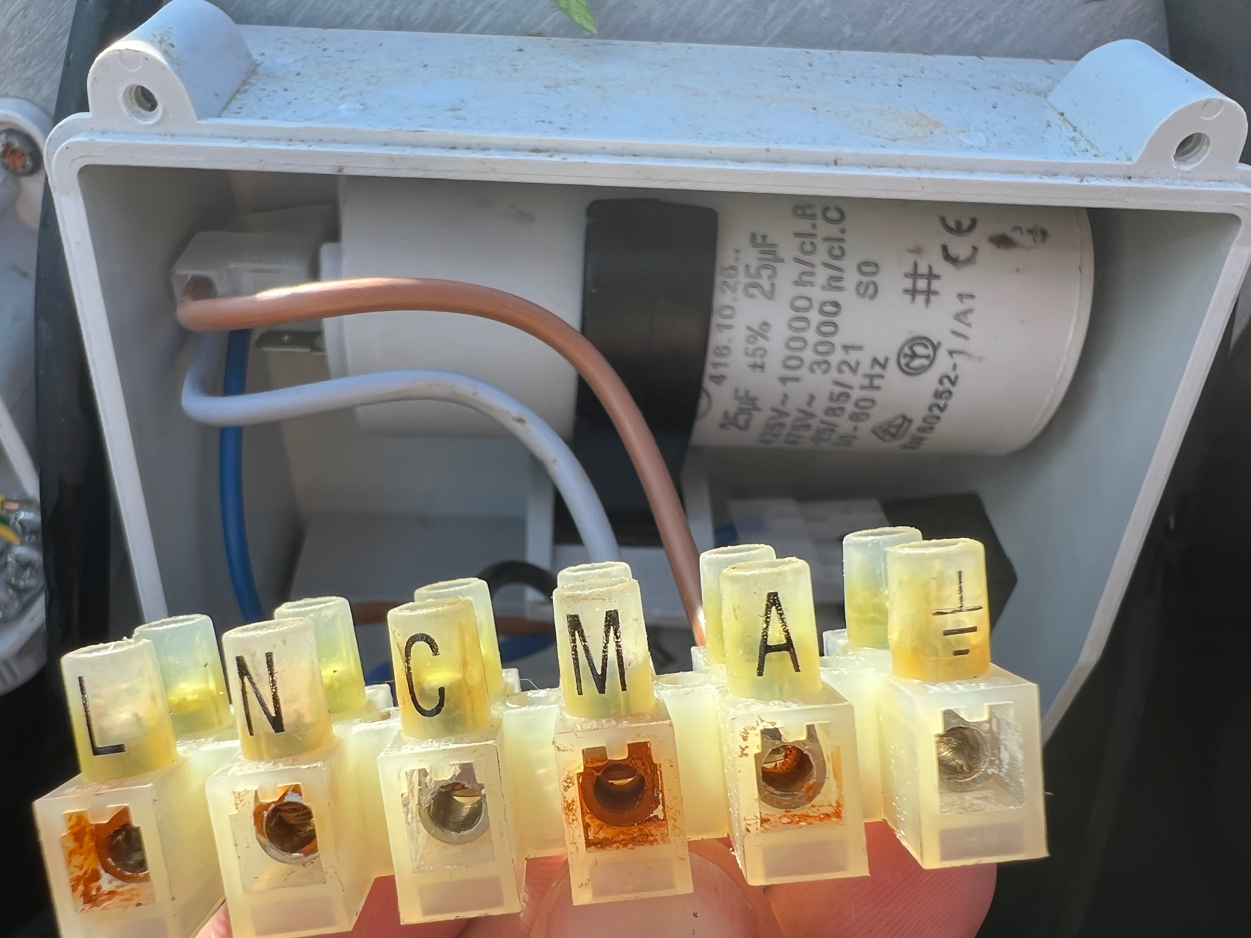 Jednofázový proud nedokáže vytvořit točivé magnetické pole, motor se tak neroztočí. Při podrobnějším zkoumání například přes teorii symetrických složek se dá odvodit, že jednofázové vinutí tvoří dvě stejně velká točivá pole opačného směru. Když se potom vezme momentová charakteristika asynchroňáku (závislost momentu na otáčkách nebo skluzu) pro oba směry a udělá se jejich součet, tak zjistíme, že nulový moment je právě při nulových otáčkách. Ostatně stačí do motoru strčit a on se rozběhne. Takový rozběh je trochu nepraktický, takže se to řeší tím, že se rozbije tato symetrie pomocným vinutím, zapojeným přes impedanci (používá se kondenzátor). Díky tomu jedno z těch dvou točivých polí převáží a motor se rozběhne příslušným směrem. Fakticky je to potřeba jen pro rozběh, proto se ten kondenzátor zapojuje třeba přes odstředivý spínač. U malých motorků ale vítězí jednoduchost s rozběhovým kondenzátorem přiopojeným trvale. V takovém případě může být v motoru vestavený, což podle obrázků vypadá na tento případ ( https://kutilska.poradna.net/files/95310-whatsapp-image-2022-06-08-at-20-jpeg ) pokud se bavíme o místě kam vede L, N a ne o spoji mezi tou čárkovaně nakreslenou krabičkou a motorem (kondenzátor je zde připojený trvale mezi svorky M a A).