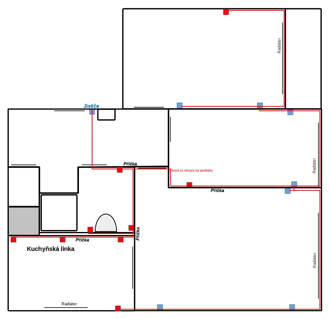 Červené čáry jsou ten nový rozvod, modré čtverečky jsou umístění původních zásuvek, kam by se daly nové zásuvky a ještě bych chtěl pár zásuvek navíc a ty jsem označil červeným čtverečkem.