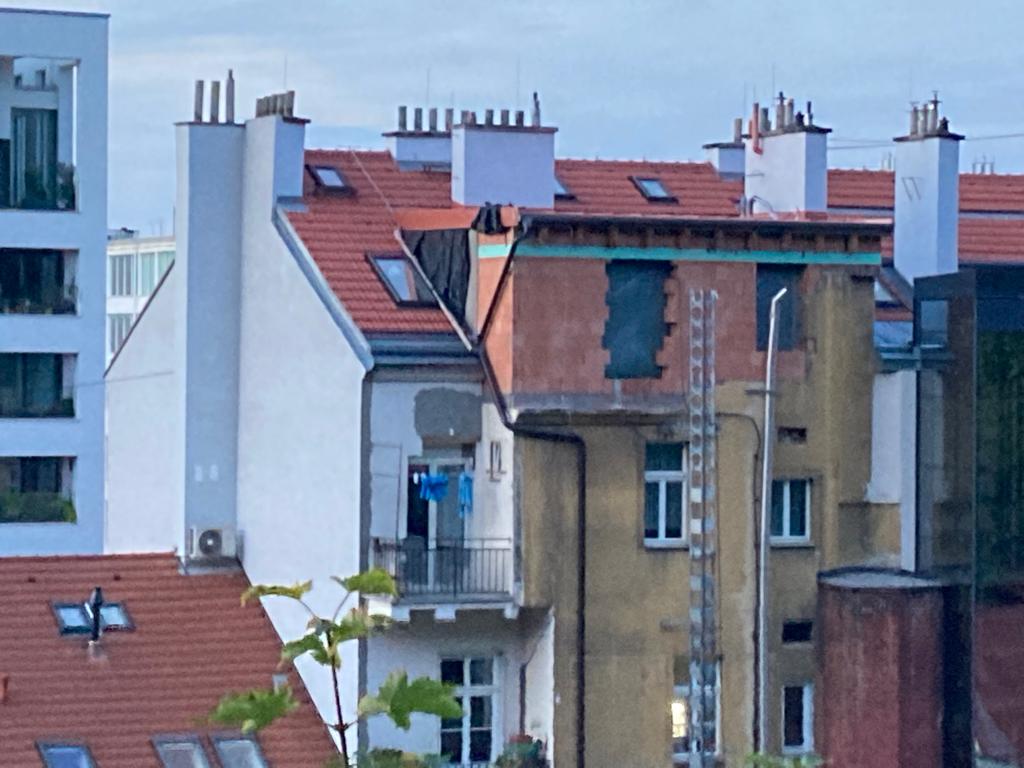 Nad balkonem, co je vidět na fotce,tam museli opravit vyváženou zeď,která se vyvalila při bourací pracích na půdě...oprava je jen perlinka s lepidlem.