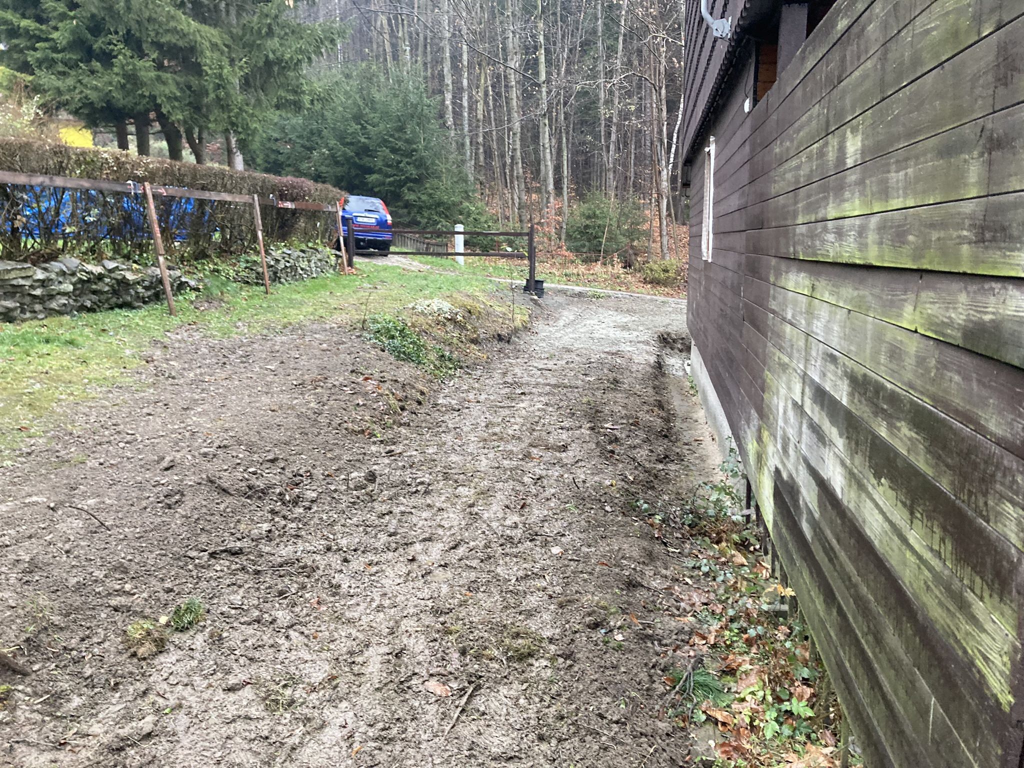 prosím o radu. Řeším úpravu terénu kolem chaty, přičemž stávající terén bude nově zvednutý cca o 30 cm. Dnes je v kontaktu se zdivem veden meliorační žlábek plnící funkci okapového chodníku a za ním je (spíše byla) trávnatá plocha s lehkým sklonem směrem do zářezu nad chatu. S ohledem na nutný pojezd bagru k vrtu byl terén stržen do roviny ke žlabu. Nyní hodlám tento terén přisypat vhodnou frakci jako trvalý chodník (cestičku) kolem chaty. Nový povrch však bude výše než stávající žlab, cca 30 cm nad úroveň žlabu (viz červeně zakreslená linie, která bude ještě pod odvětrávací mřížkou sklepa).