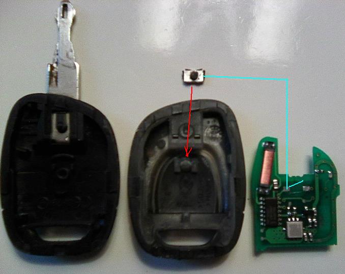 Když jsem měl klíček kvůli výměně baterky rozdělaný, tak jsem opatrně vyloupnul desku elektroniky a pod ní byl volně sypaný čudlík co byl asi původně přidělaný na hmatníku tlačítka a asi sloužil ke zkratování dvou plošek na desce elektroniky při stisknutí hmatníku.