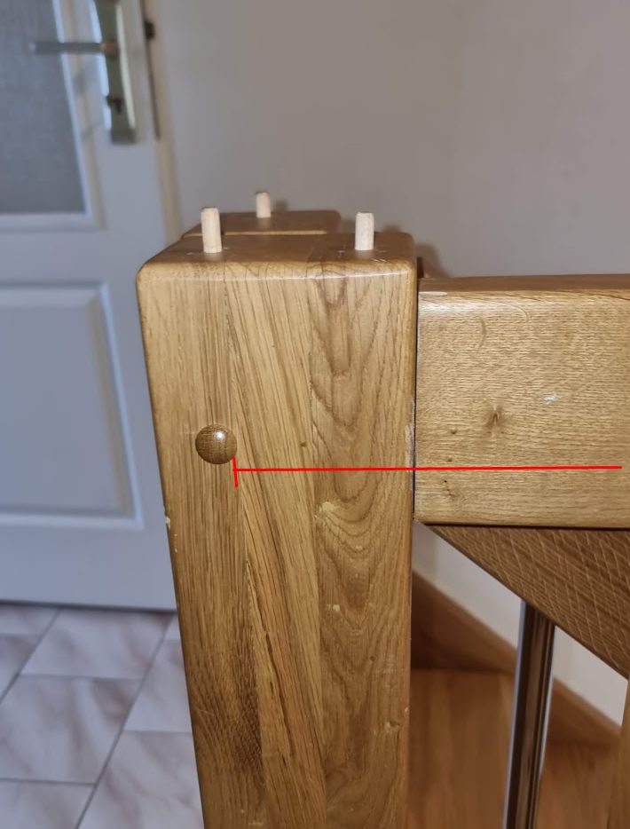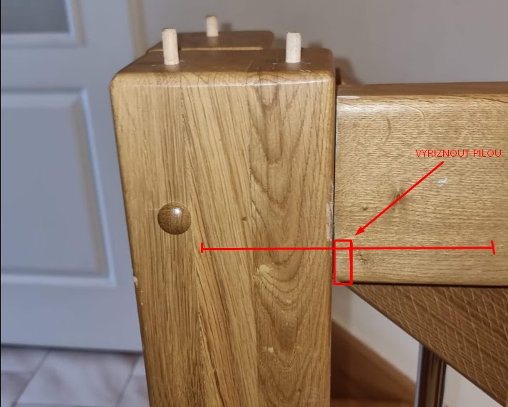 Nejsnadnější asi bude fiknout to flexou/pilkou ve spoji a pak udělat novou díru vedle. Původní díry zalepit kolíkem a přebrousit. Místo řezu též nějak vyplnit kousky dřeva, zalepit, přebrousit a zalakovat. Je to trochu truhlařiny, to jo.