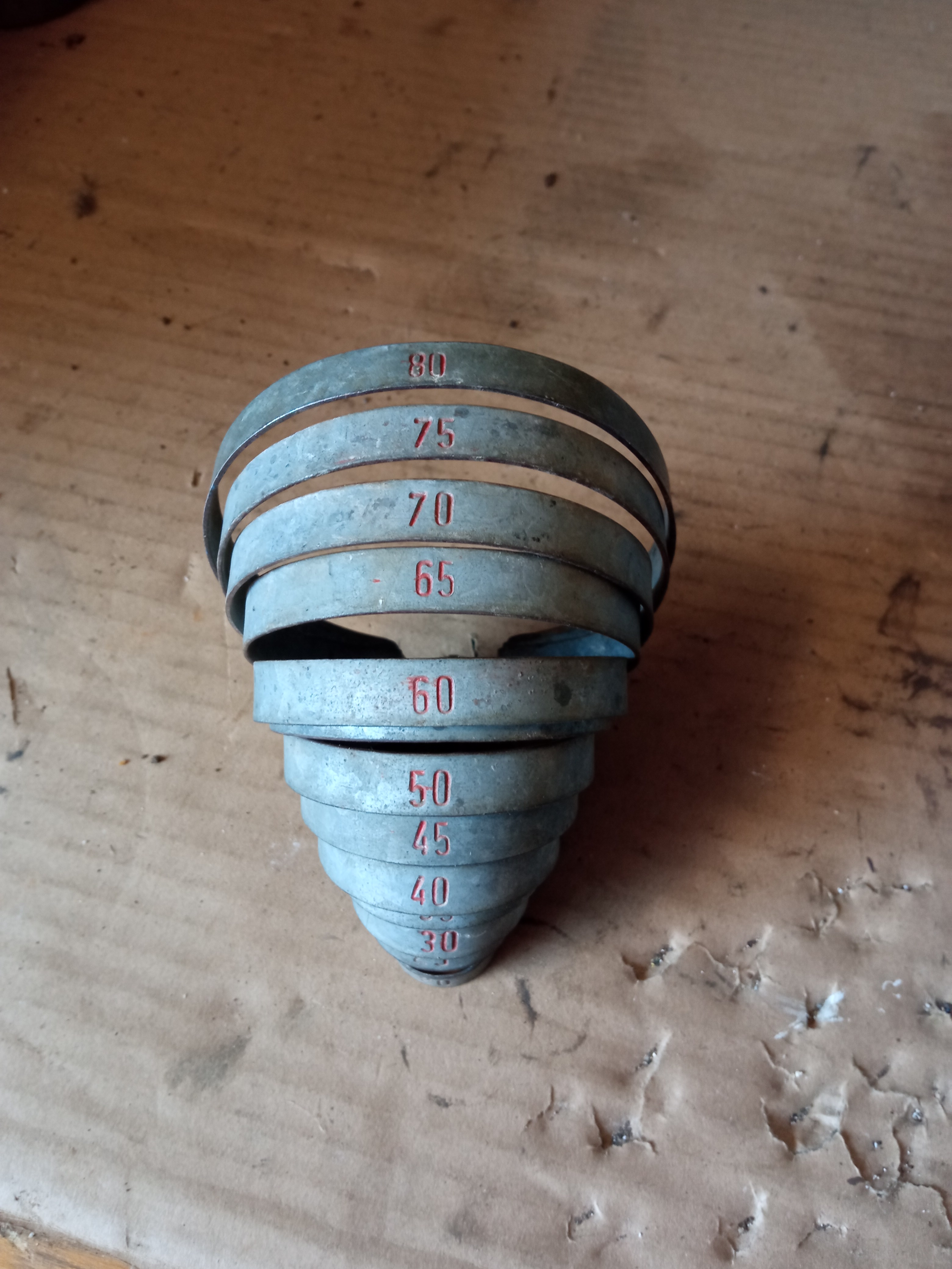 Nemá někdo ponětí k čemu se používali tyto kalibrační měrky z plechu o průměru od 20 do 80mm po 5ti milimetrech
