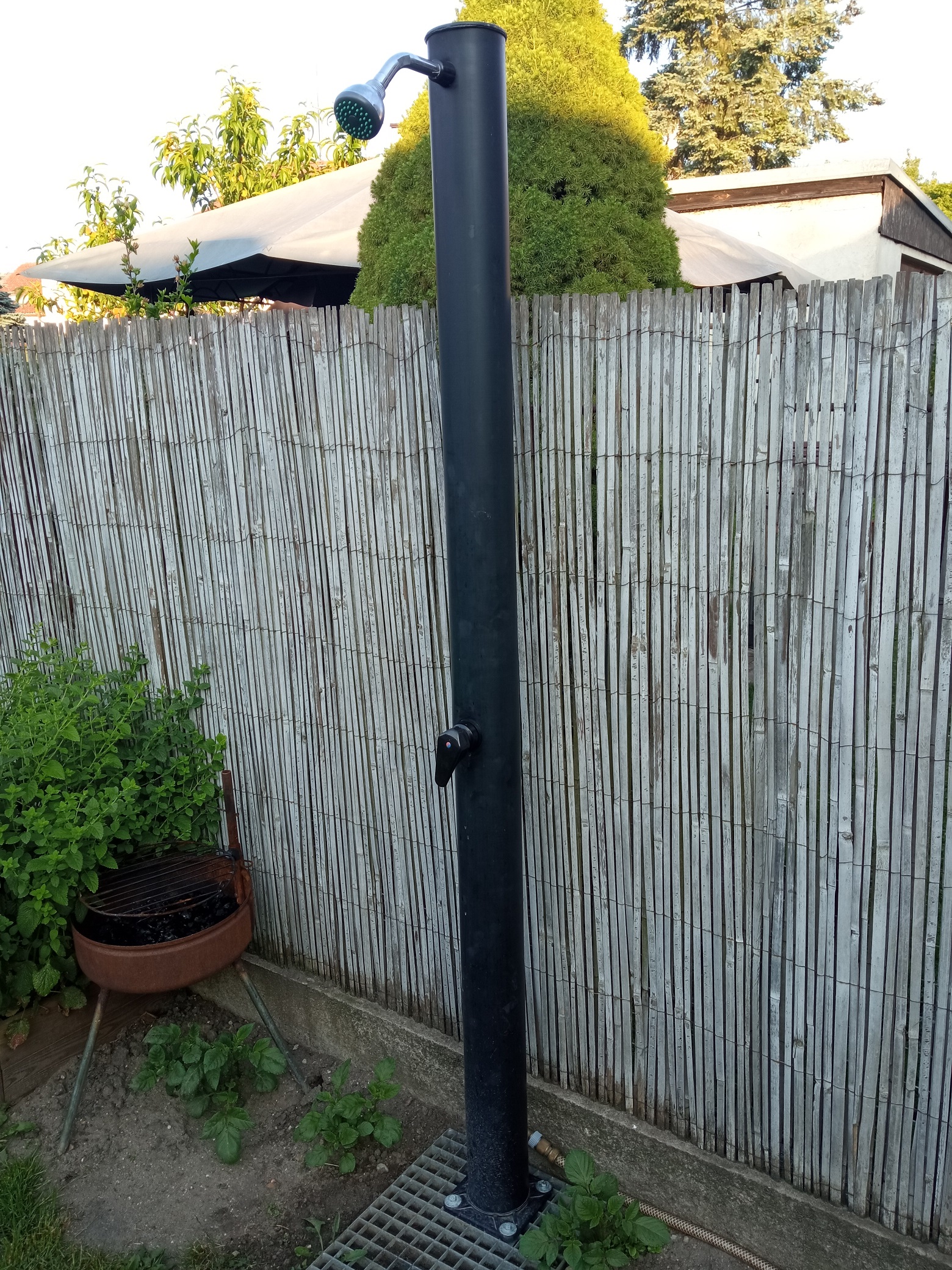 Takovej ten černej plastovej sloup? Tyhle zahradní sprchy se dělají jako beztlakové, takže to chování je normální. Pokud to tedy necrčí proudem. Když tak sem hoď fotku nebo odkaz, ať je jasné o čem se bavíme.