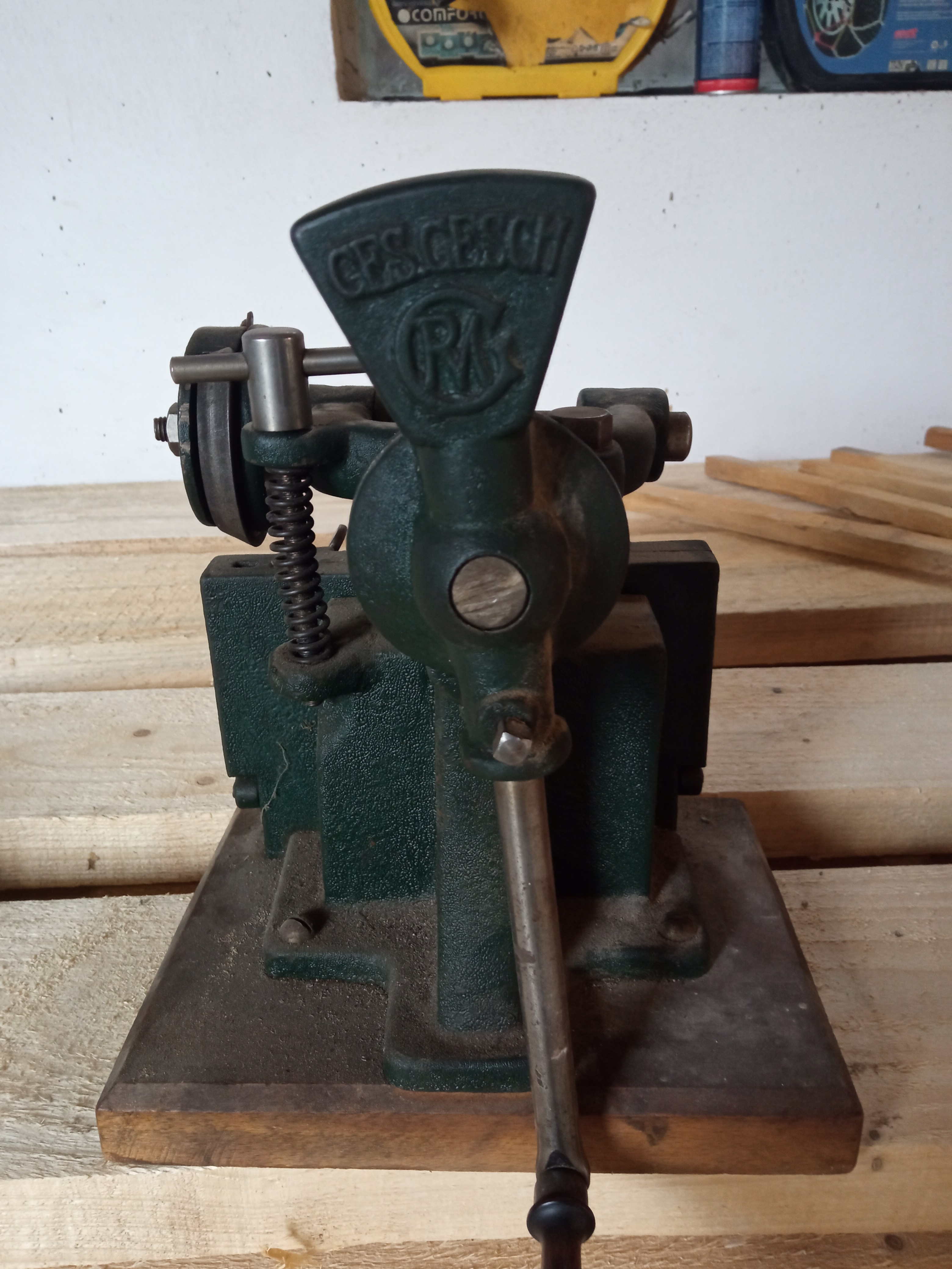 Ten nápis znamená "chráněno patentem".Fabrika GPM funguje,ale vyrábí již moderní stroje.Chtělo by to nějaká německá technická muzea,hodně mě to zajímá,budu hledat dál.Spousta podobných starých strojů je na bazarech,včetně ebay.Jenže ani prodejce nemusí vědět co má,tudíž dle názvu se to asi nedohledá.Třeba loni jsem se dal do řeči s prodejcem veteše na burze v Novém Bydžově,také stroj na kliku,myslel,že je to do kuchyně na placky,jednalo se o ruční klikou poháněný mačkač na oves.Na burzách je spousta prodávaných věcí a lidé ani netuší co mají a prodají to za pár pětek.Asi před čtyřmi lety na té samé burze,malé kovové hodiny,něco nezvyklého,jednalo se o hodně starý výrobek pro kontrolu obchůzkářů.Na ciferníčku kolíček,který obchůzkář musel v přesný čas zmáčknout a ten udělal dirku do uvnitř vloženého štítku,bylo to uzamykatelné,aby obchůzkáři nemohli švindlovat.Když jsem tam vysvětlil účel,pán za mnou je hned koupil.Prodejce mi děkoval,že to vozí několik let a nikdo nevěděl k čemu to slouží.Hodin mám desítky,ale na zdi,toto mě neoslovilo.