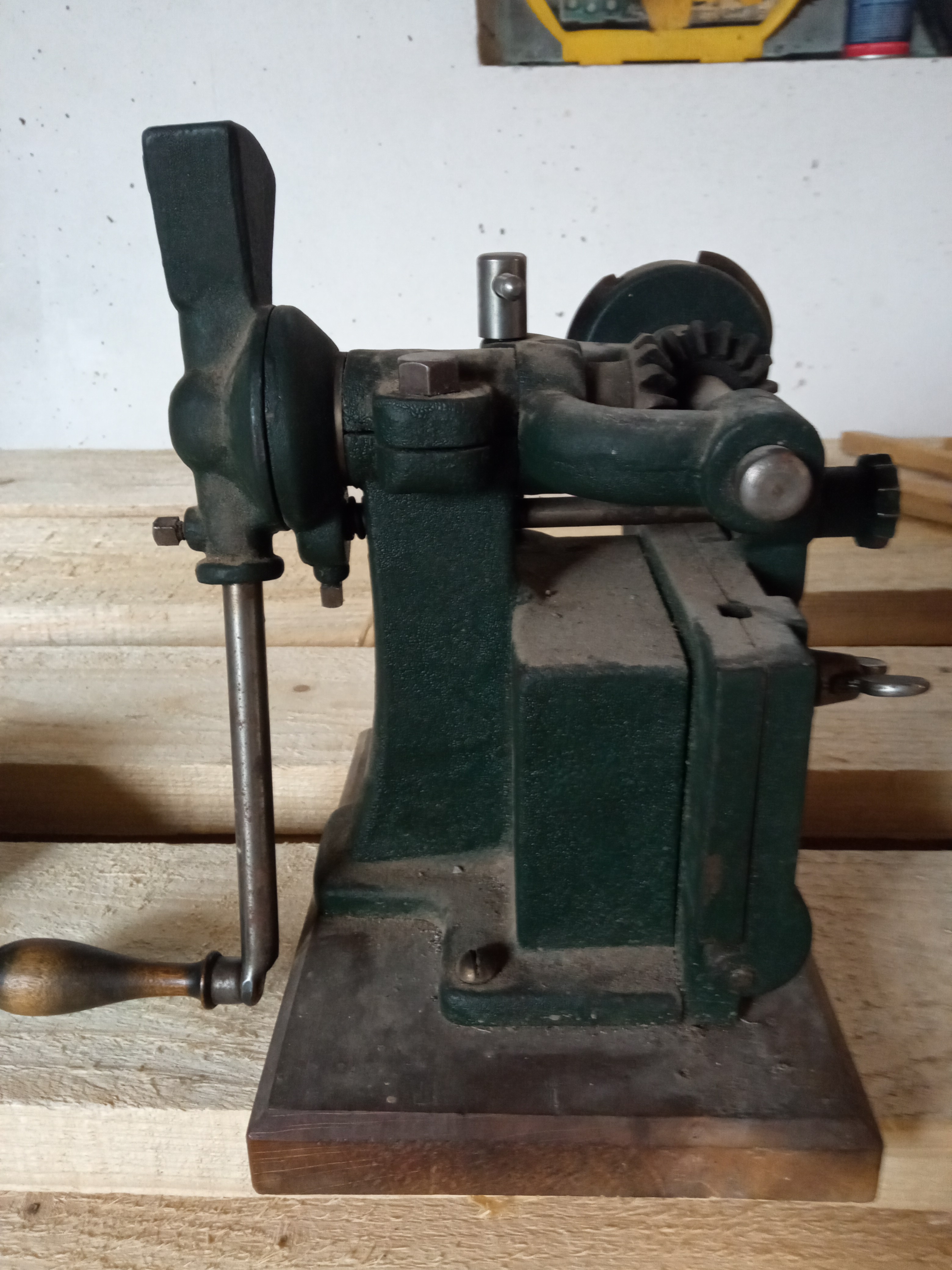 Zdravím,děkuji za přiblížení,takže ozub je jen matka.Toho špalíčku Jsem si také všiml,nyní přijít na to,co bylo v těch čtyřhranných otvorech.Nemohlo to sloužit k velké produkci řezu,má to malé otáčky,pouze přes kliku,je tam i velké závaží pro usnadnění práce obsluhy. Ten mechanizmus chápu jak popisujete.Jedná se opravdu o nůž na tom bubnu,zkuste pilníčkem tvrdost materiálu.Ono to může zdánlivě klamat.Už jen to,je to malé,nemohlo to obrábět velké věci.Dejte sem prosím pár detailních fotek toho bubnu na hřídeli.Třeba budeme mít štěstí.Na dnešek v noci jsem použil pár vyhledávačú fotografií podle zadaného obrázku.Na základě těch co máte v dotazu to vyhodilo stovky strojů na kliku,ale tento nikoli.Třeba to detailní foto nástroje při hledání pomůže,děkuji.