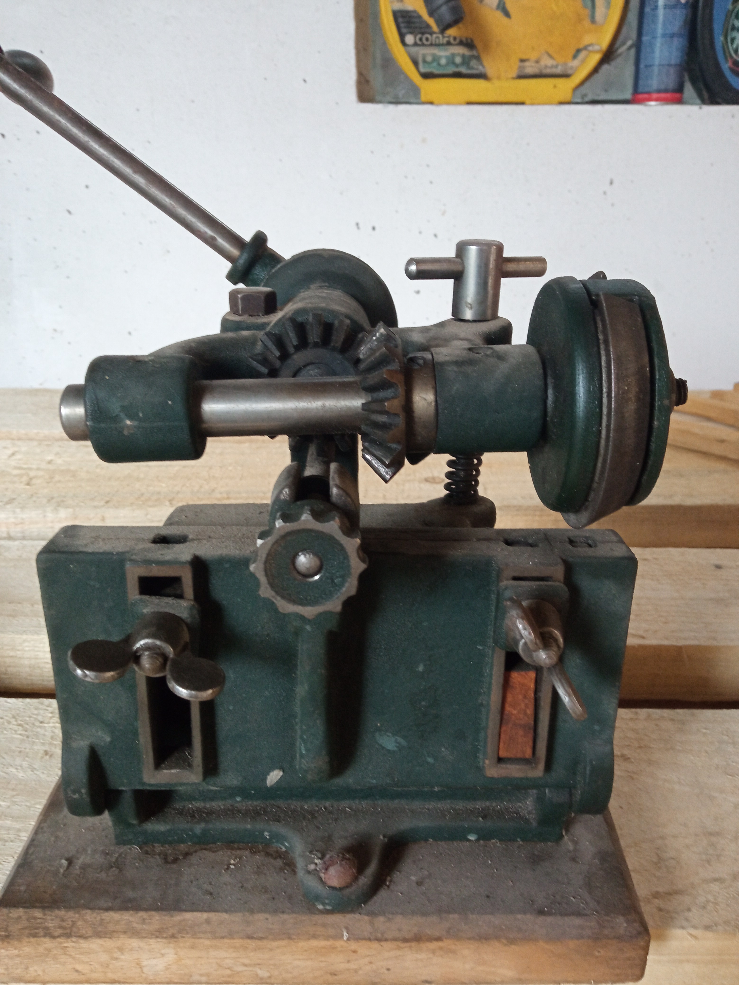 Ten mechanizmus chápu jak popisujete.Jedná se opravdu o nůž na tom bubnu,zkuste pilníčkem tvrdost materiálu.Ono to může zdánlivě klamat.Už jen to,je to malé,nemohlo to obrábět velké věci.Dejte sem prosím pár detailních fotek toho bubnu na hřídeli.Třeba budeme mít štěstí.Na dnešek v noci jsem použil pár vyhledávačú fotografií podle zadaného obrázku.Na základě těch co máte v dotazu to vyhodilo stovky strojů na kliku,ale tento nikoli.Třeba to detailní foto nástroje při hledání pomůže,děkuji.