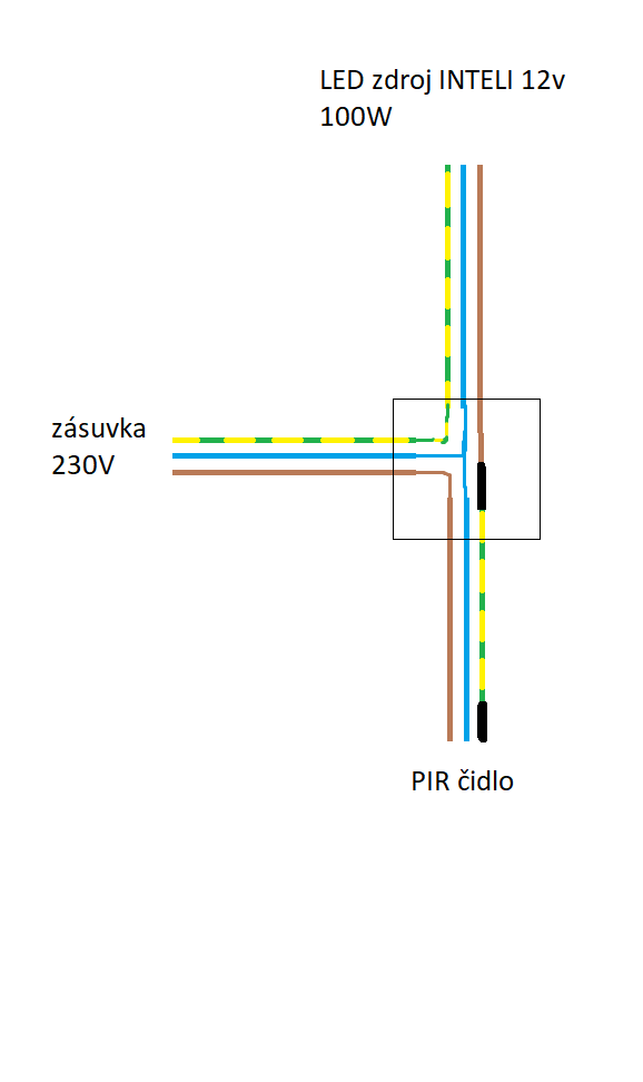 1) jak se nazývá, nebo jestli vůbec existuje kabel s 2 vodiči pro fázi a 1 pro nulák. Na nákresu v příloze je naznačeno jak mě napadá vyřešit můj problém s tím, že do PIR čidla chci dovést jen 1 kabel (tzn přívod do PIR a z něj odvod po 1 kabelu zpátky pro zdroj LED). Ano vím že se PE nikdy nesmí přeznačit, ale ten kabel bude volně položený na skříni v celkové délce asi 40cm, takže oba konce jsou jasně rozeznatelné. Chtěl bych to ale udělat tak, jak se má. Nemůžu ovšem takový kabel na internetu najít.