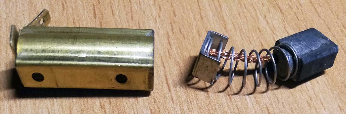 Zdravím,musíte vyjmout ten mosazný plech,je to tam nasunuté.Spodem to nepůjde,uhlíky budou mít drážku,která je zastaví před ubroušením,protože by jinak došlo ke zničení komutátoru ocelovou přítlačnou pružinkou po úplnném odbroušení uhliku.Většinou to vyjmu a koupím uhlíky nové,když je jiný ,větší rozměr,doladím na skleněné desce na jemném smirku.Někdy se stane,že ty nové nemají tu drážku,vypiluji ji jehlovým pilníkem,kousek tam musíte nechat plný materiál,výstupek v pouzdře uhlik zastaví před totálním ubroušením.
