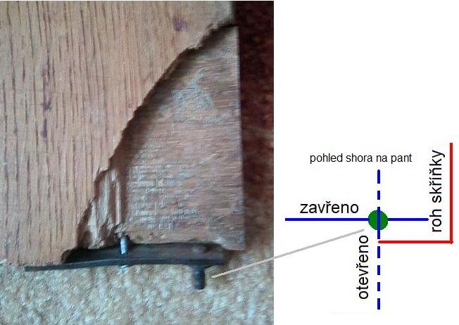Jak opravit vylomený kus, aby držel ten pant? Vpravo jsem se pokoušel načrtnout, jak se ta dvířka otevírají, klasický pant by se tam asi těžko dával.