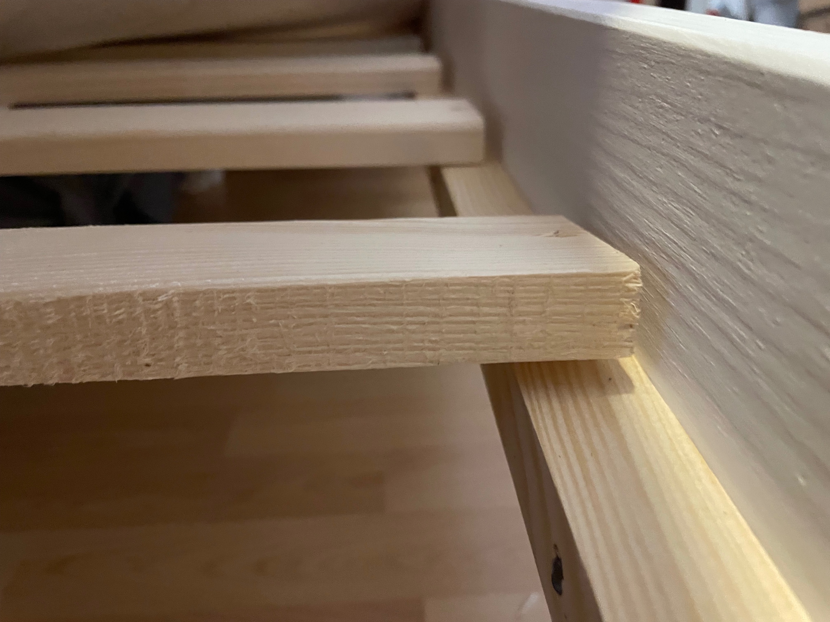 Tak to je něco jiného,my to měli lamely hodně tenké,kvalitní dřevo,doslova mírný tvar lučiště směrem pod matraci,ty nemohly být připevněny,při zatížení se prodlužovaly při prohybu.Toto co máte je měkké dřevo,silné latě,přišroubujte je vruty.Možná by nebylo na škodu pod každý spoj čtvereček látky,stačí z bavlněného trička,nebo flanelové košile,aby dřevo o sebe nevrzalo.:-)